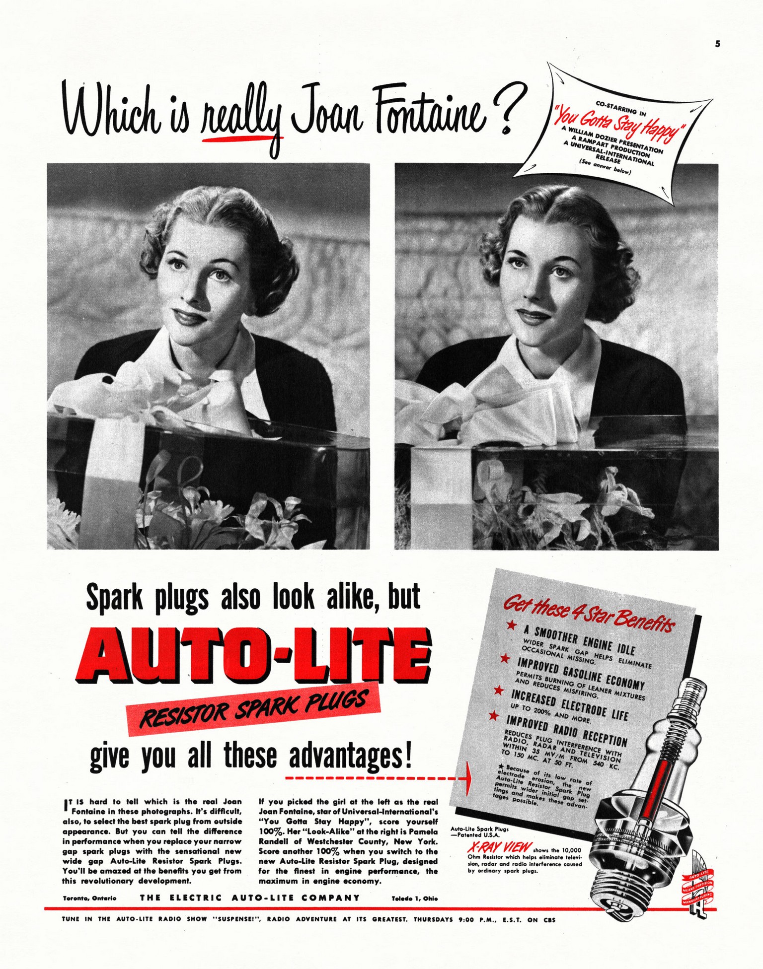 1949 Which is really Joan Fontaine. Spark plugs also look alike, but Auto-Lite Resistor Spark Plugs give you all these advantages!