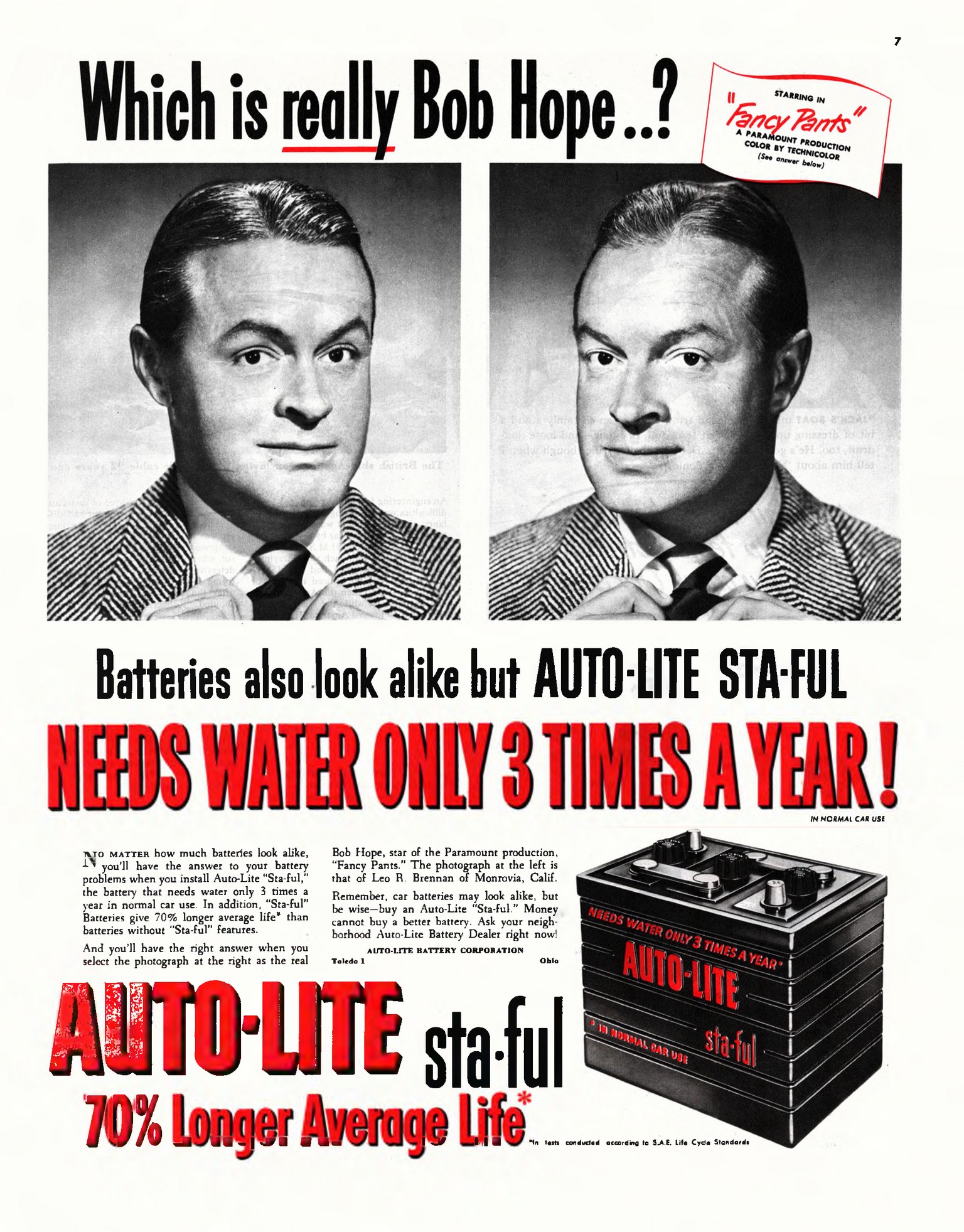 1950 Which is really Bob Hope… Batteries also look alike but Auto-Lite Sta-Ful Needs Water Only 3 Times A Year!