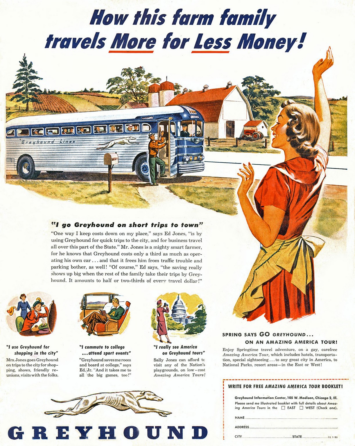 1950 How this farm family travels More for Less Money! Greyhound