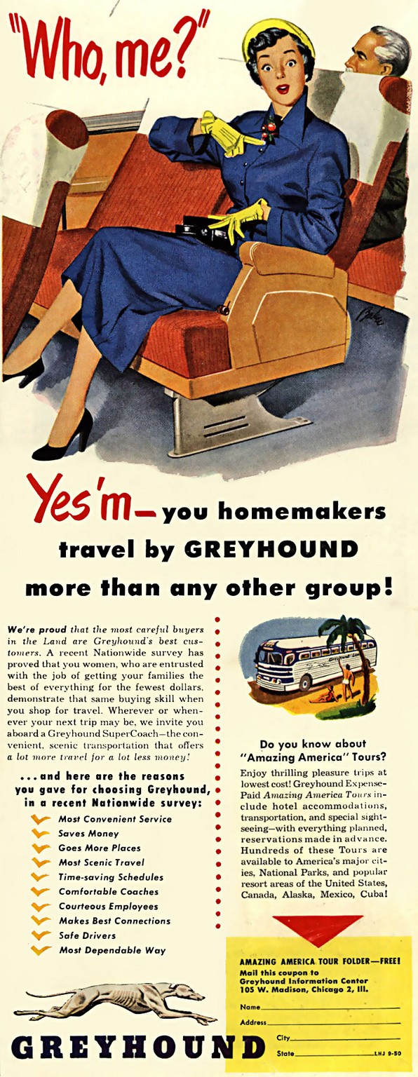 1950 ‘Who, me?’ Yes,m – you homemakers travel by Greyhound more than any other group!There’s One Sure Way to get the finest, most frequent Thru-Express Service to all parts of America. Go Greyhound!