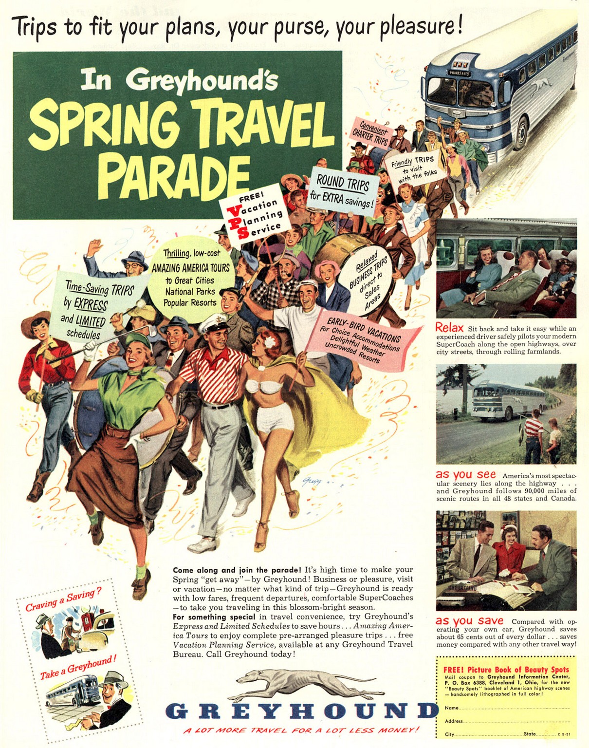 1951 Trips to fit your plans, your purse, your pleasure. In Greyhound’s Spring Travel Parade