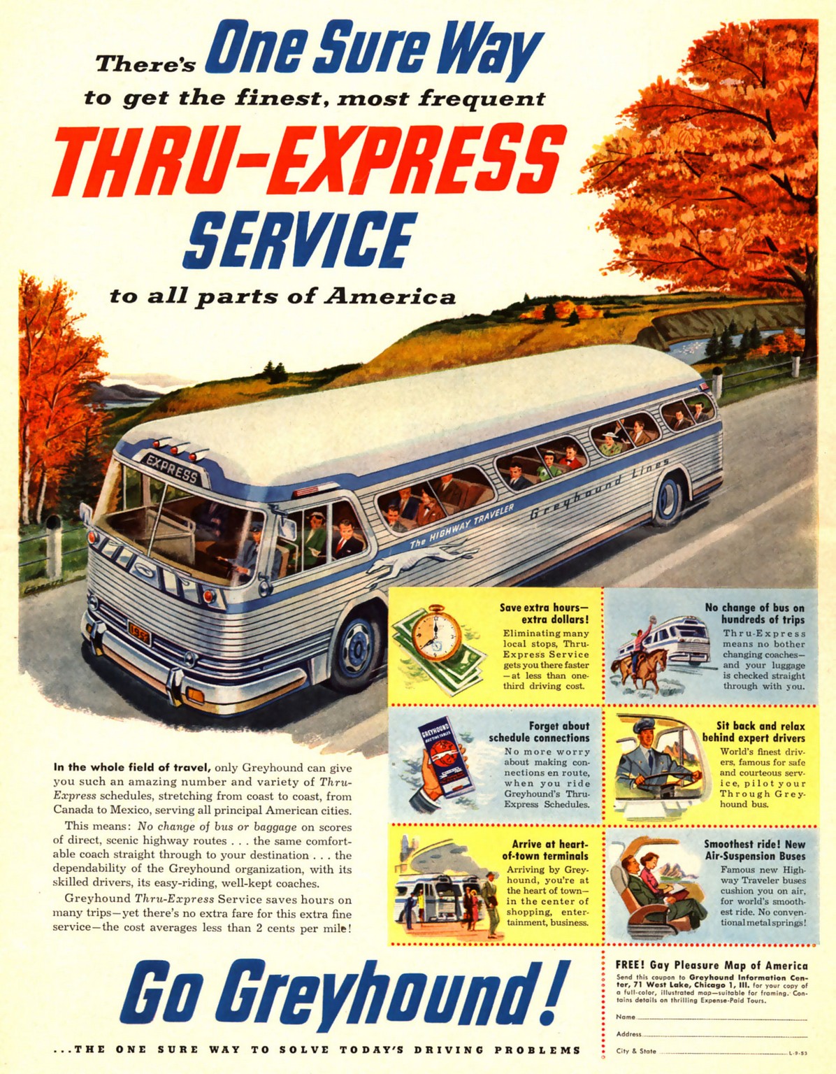 1953 There’s One Sure Way to get the finest, most frequent Thru-Express Service to all parts of America. Go Greyhound!
