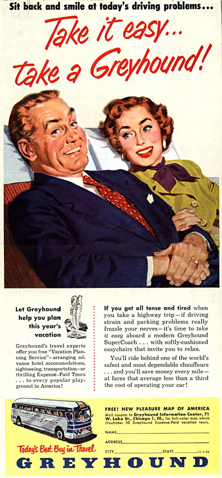 1954 Sit back and sime at today’s driving problems… Take it easy… take a Greyhound!