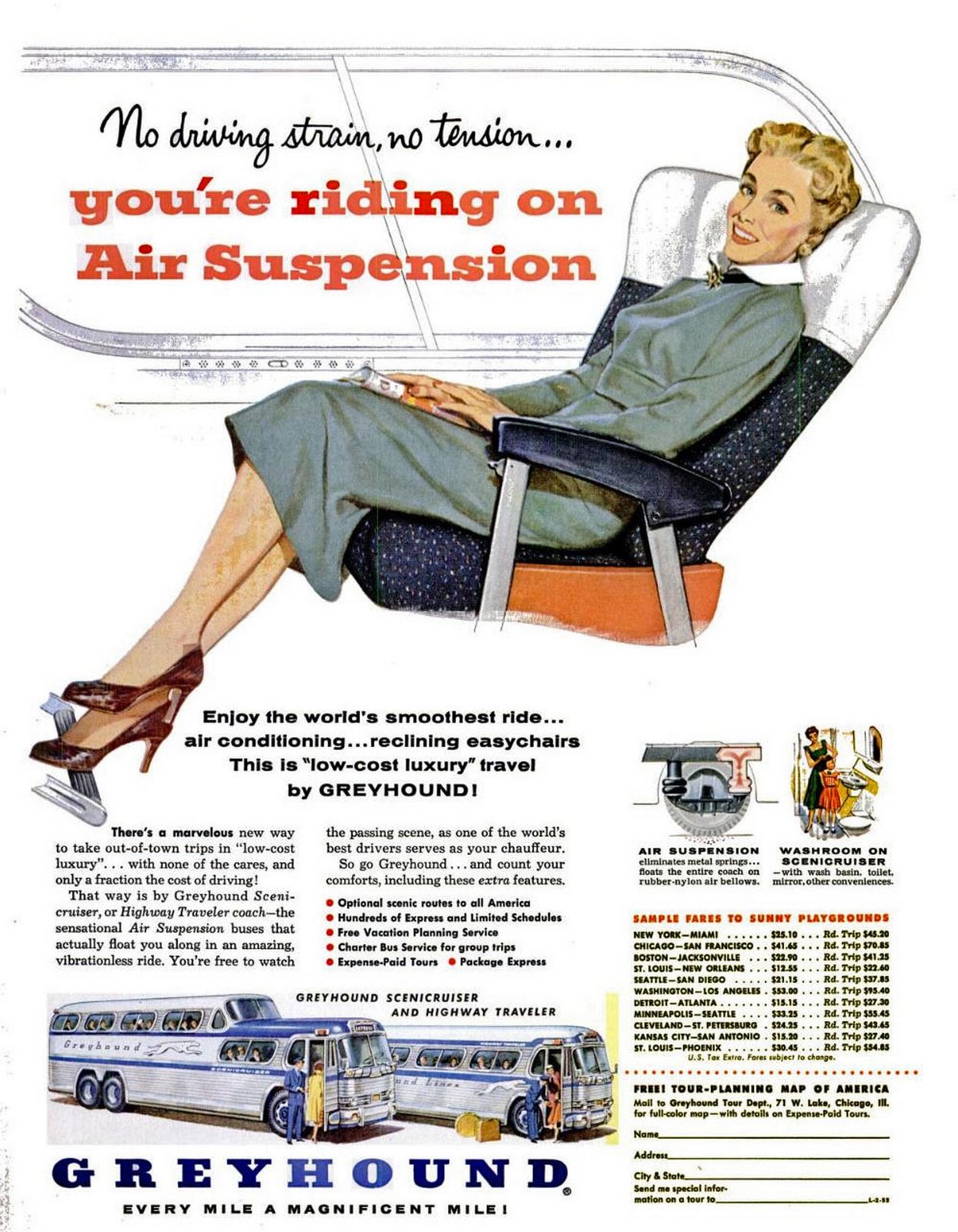 1955 No driving strain, no tension... you're riding on Air Suspension. Greyhound