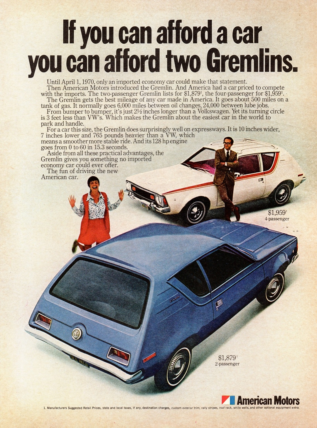 1970 American Motors Gremlin. If you can afford a car you can afford two Gremlins