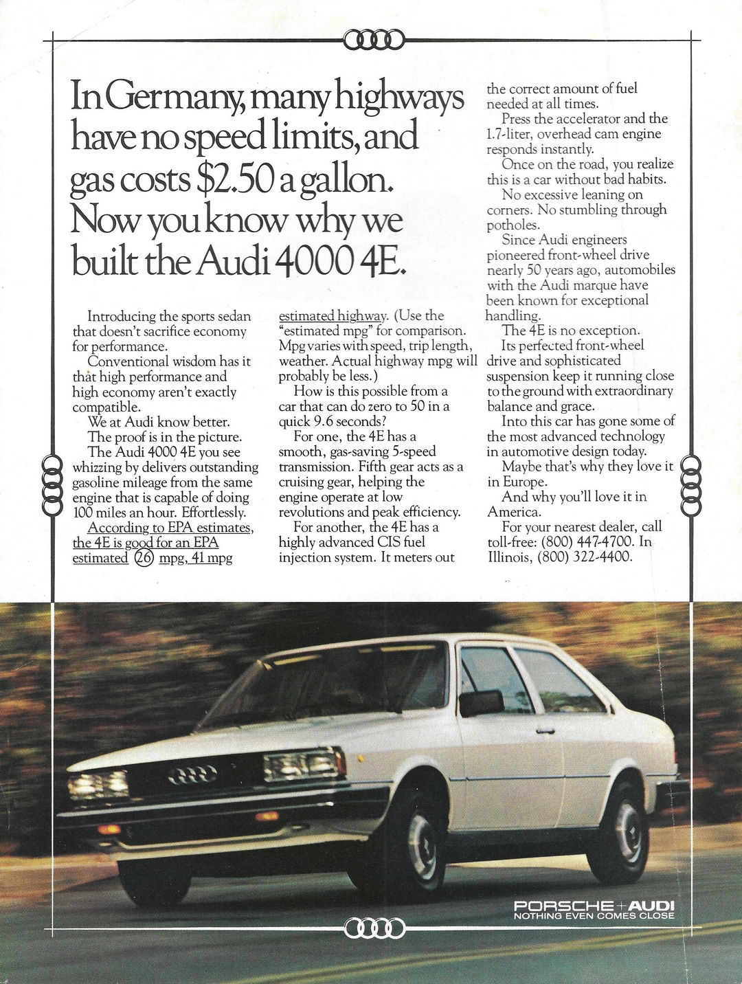 1980 Audi 4000 E4. In Germany, many highways have no speed limits, and gas costs $2,50 a gallon. Now you know why we built the Audi 4000 4E