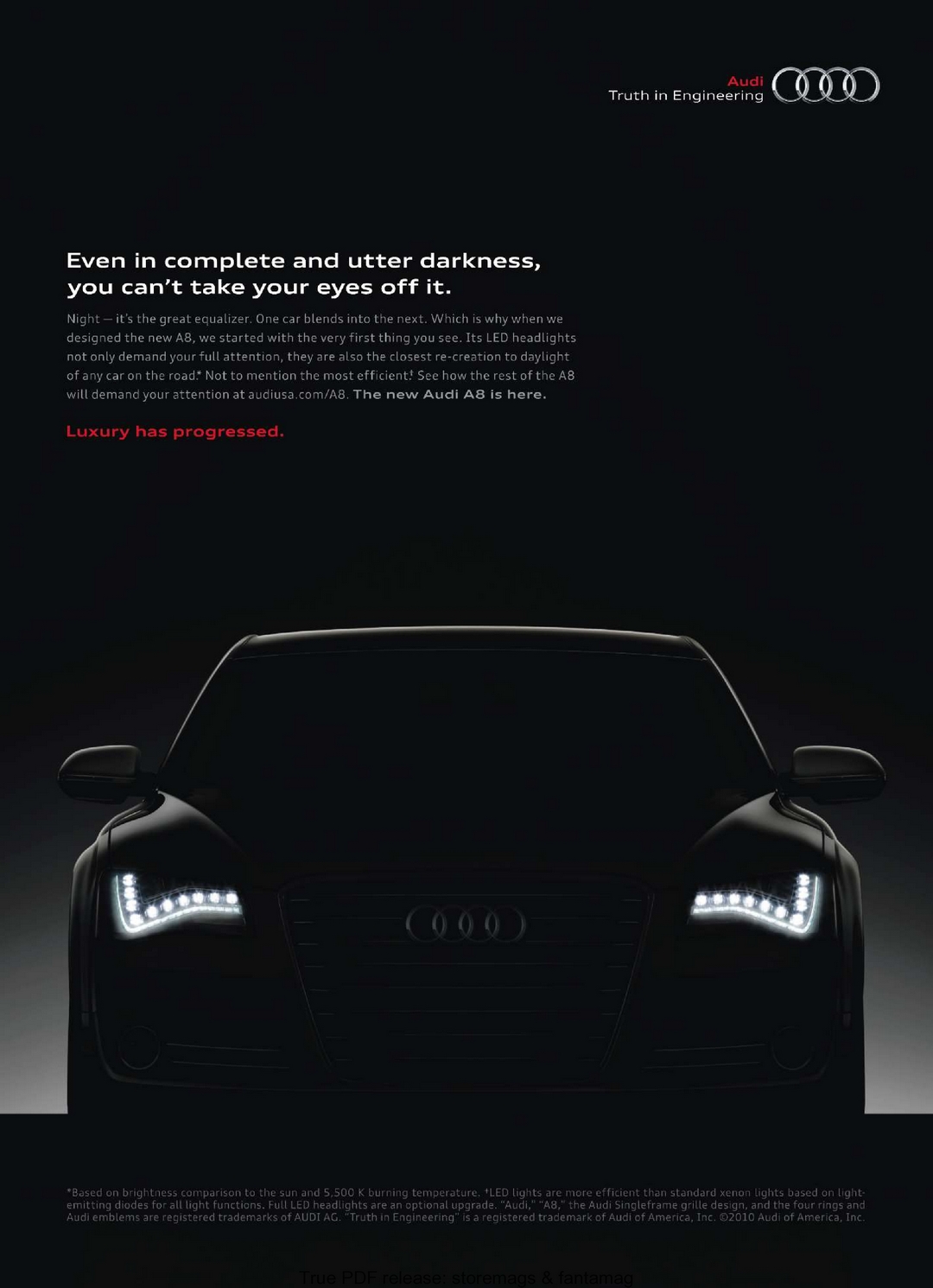 2011 Audi A8. Even in complete and utter darkness, you can’t take your eyes off it. Luxury has progressed