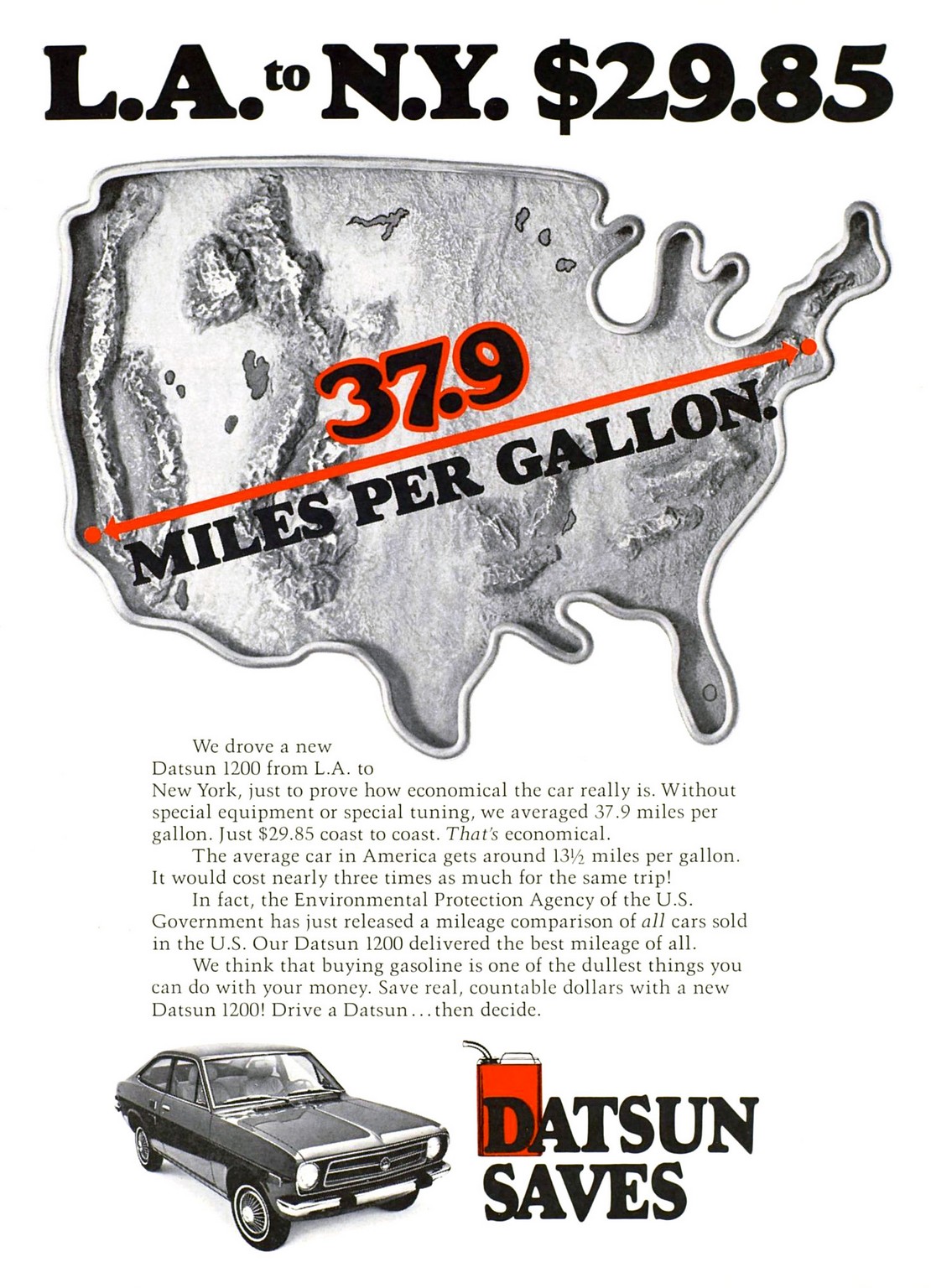 1973 Datsun 1200. L.A. to N.Y. $29.85