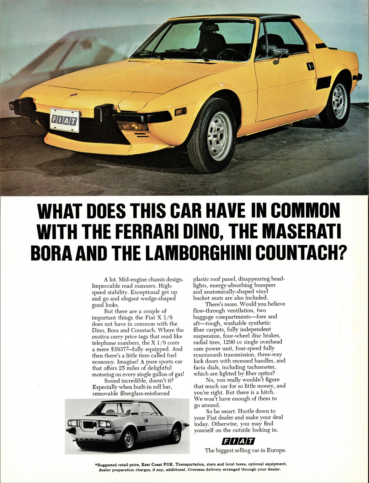 Main » Cars » Fiat Ad and Poster Collection » 1974 Fiat X-19. What Does This Car Have In Common With The Ferrari Dino, The Maserati Bora And The Lamborghini Countach