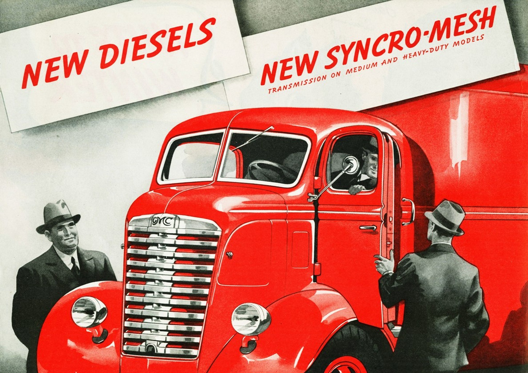 Main » Cars » GMC Ad and Poster Collection » 1939 GMC C.O.E. Trucks. New Diesels. New Syncro-Mesh