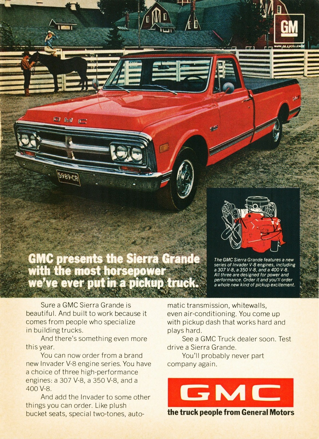 Main » Cars » GMC Ad and Poster Collection » 1970 GMC Sierra Grande V-8 Pickup with the most horsepower we’ve ever put in a pickup truck