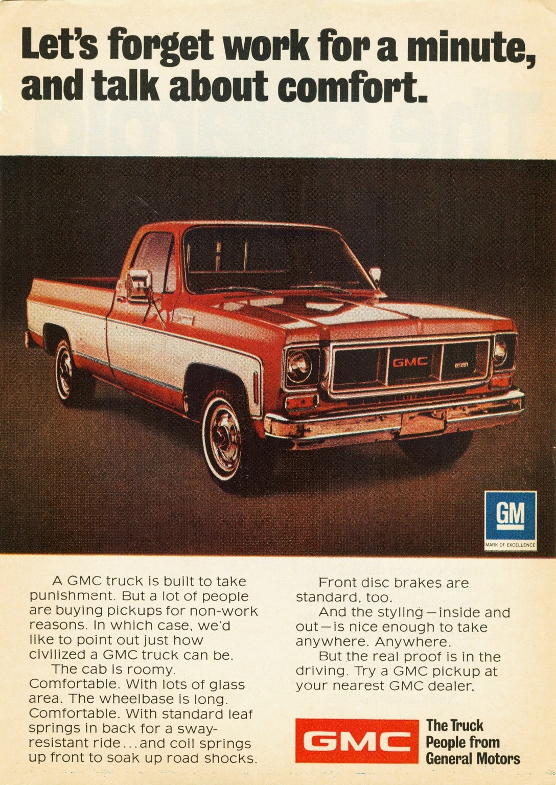 Main » Cars » GMC Ad and Poster Collection » 1974 GMC Sierra Grande Wide-Side Pickup. Let’s forget work for a minute, and talk about comfort