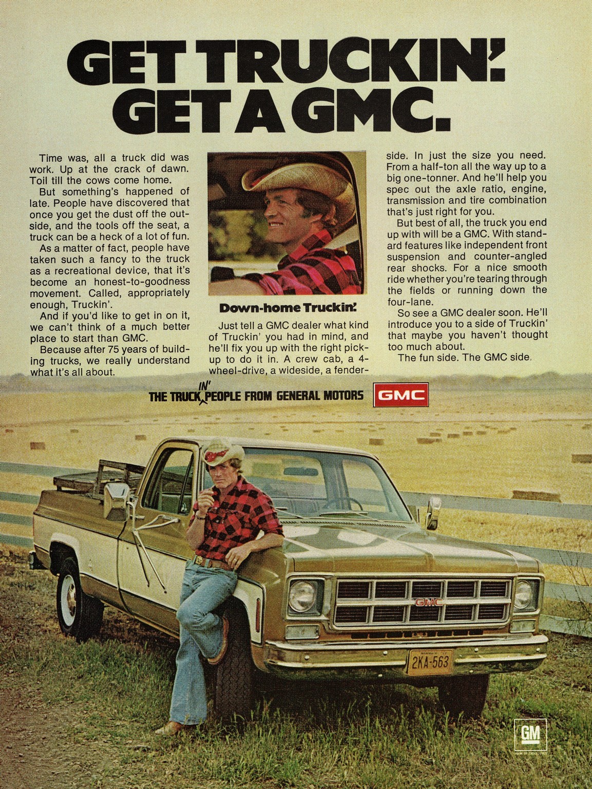 Main » Cars » GMC Ad and Poster Collection » 1977 GMC Sierra Classic Pickup. Get Truckin’. Get A GMC