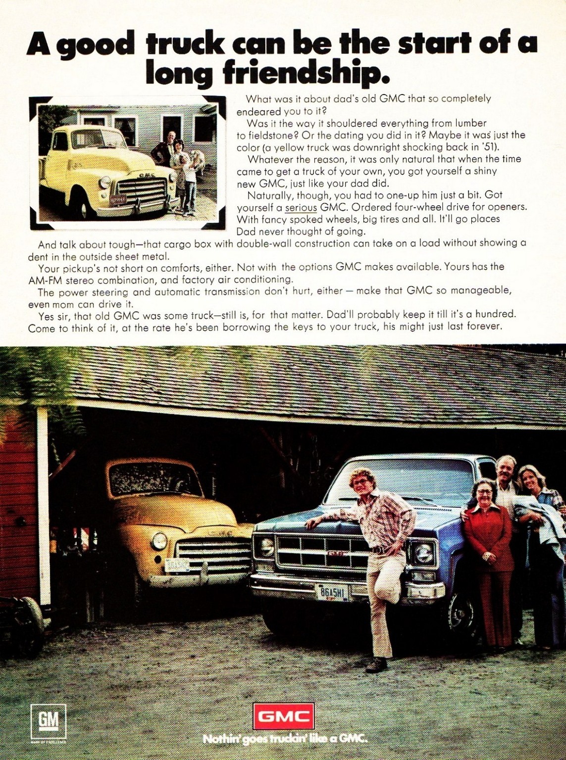 Main » Cars » GMC Ad and Poster Collection » 1978 GMC Pickup with 1951 GMC Pickup. A good truck can be the start of a long friendship