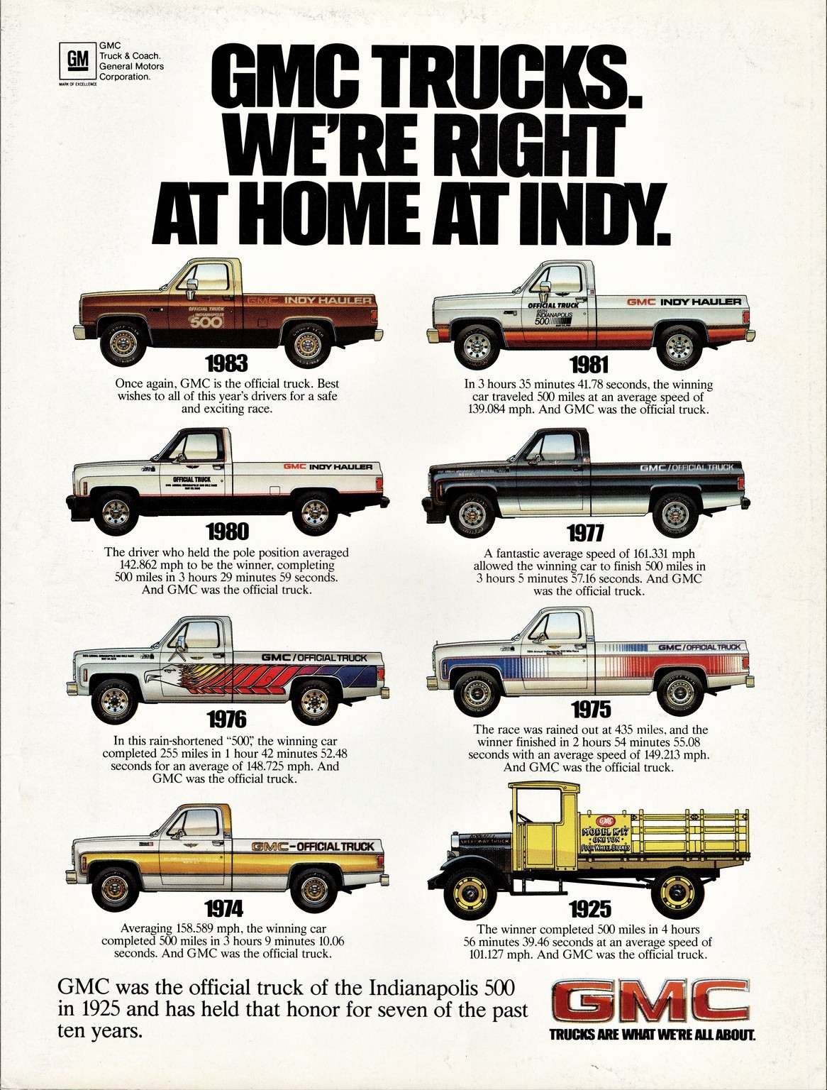 Main » Cars » GMC Ad and Poster Collection » 1983 GMC Indy Trucks. We’re Right At Home At Indy