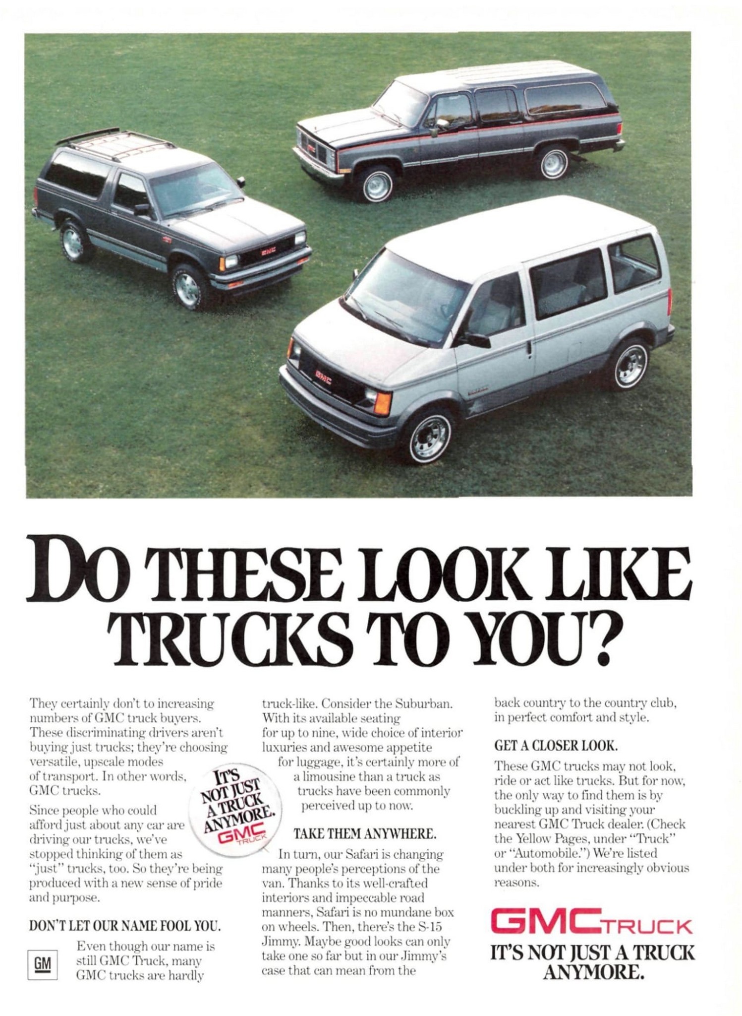 Main » Cars » GMC Ad and Poster Collection » 1987 GMC Truck. Do These Look Like Trucks To You