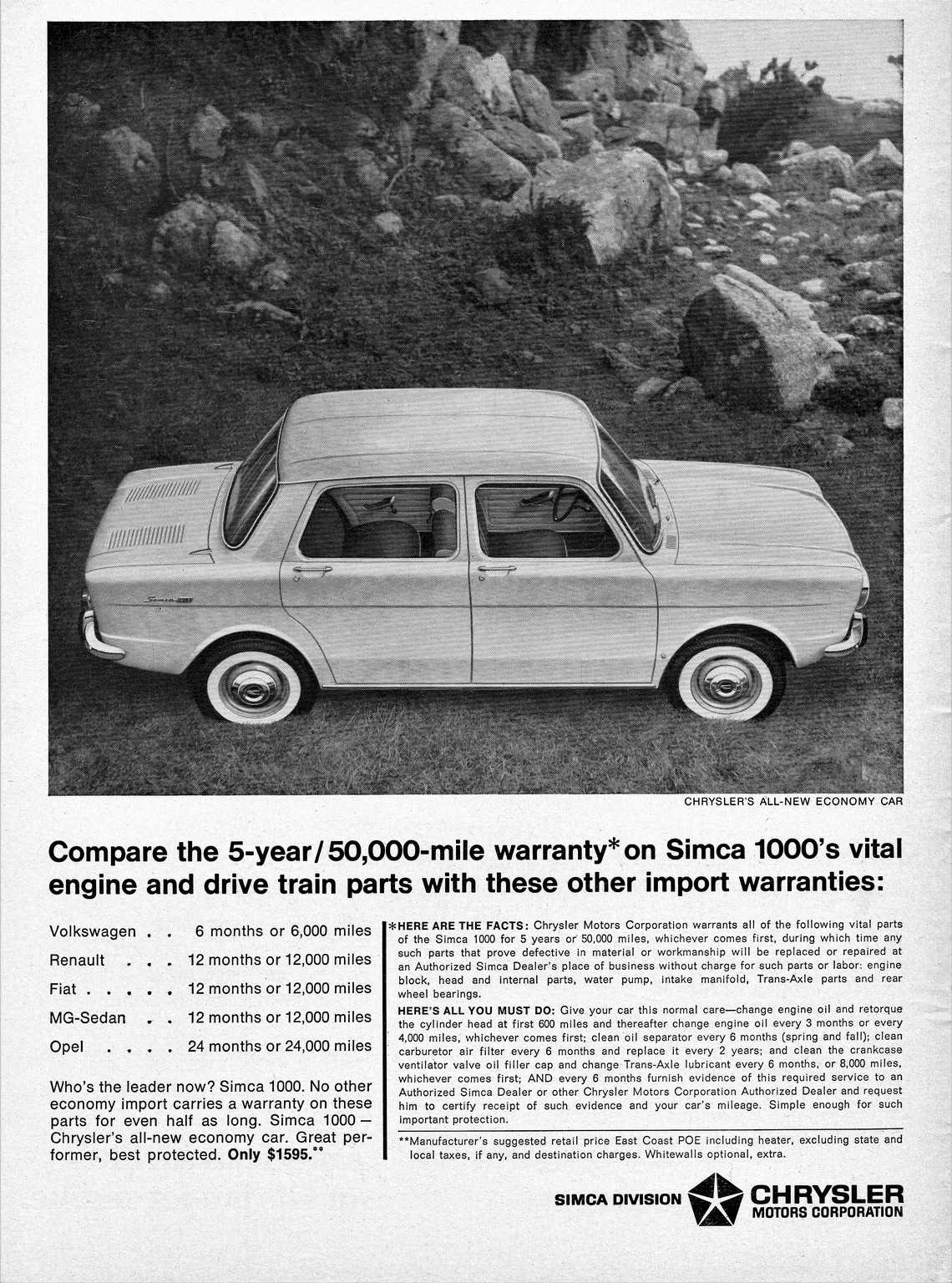 1965 Simca 1000. Compare the 5-year - 50,000-mile warranty on Simca 1000's vital engine and drive train parts with these other import warranties