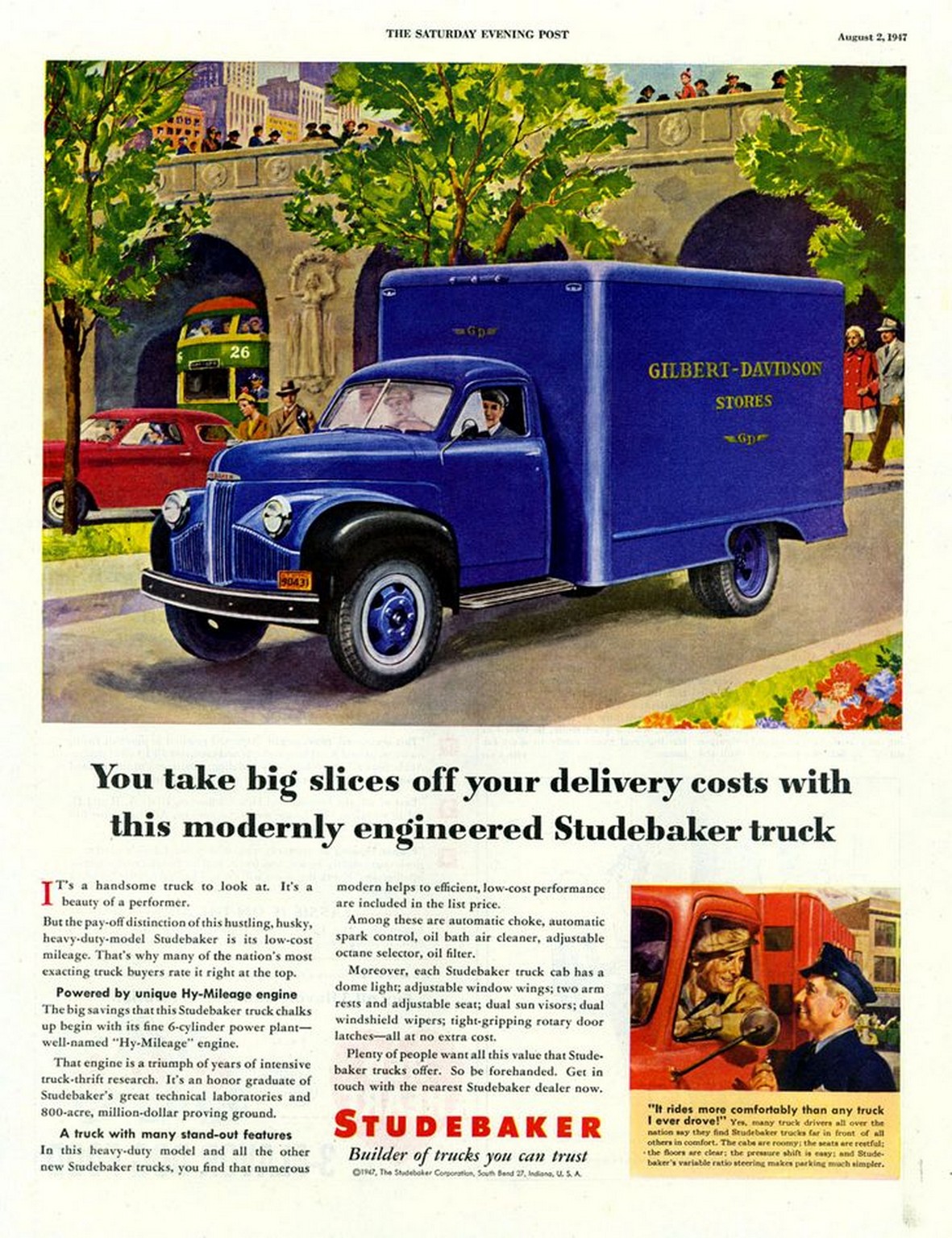 1947 Studebaker Truck. You take big slices off your delivery costs with this modernly engineered Studebaker truck