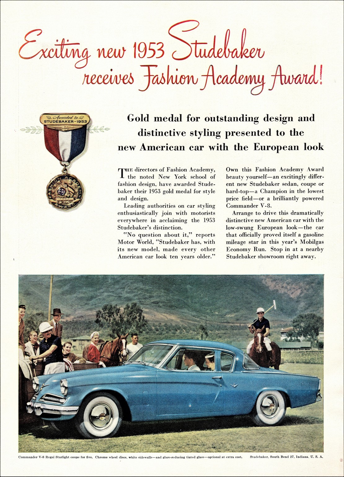 1953 Studebaker Commander V-8 Regal Starlight Coupe. Exciting new 1953 Studebaker receives Fashion Academy Award!