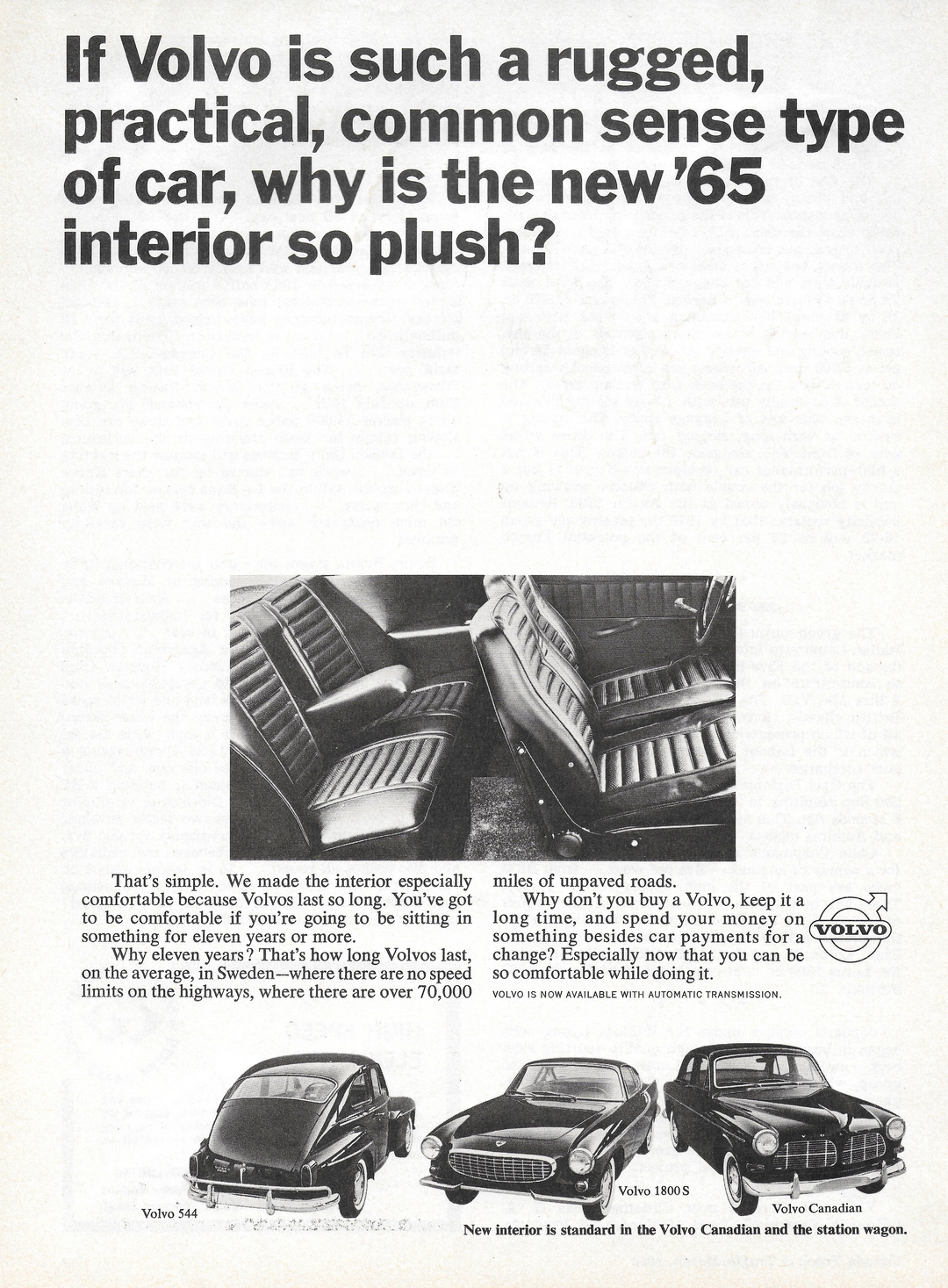 1965 Volvo. If Volvo is such a rugged, practical, common sense type of car, why is the new '65 interior so plush