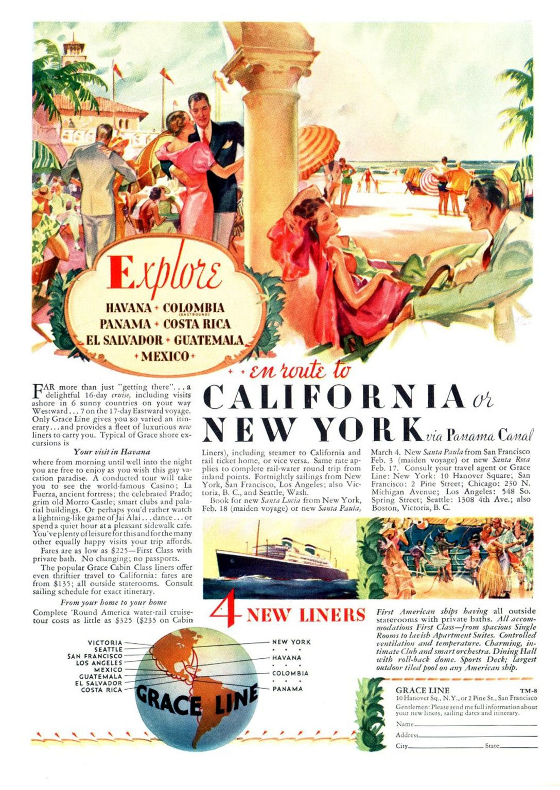 1933 Explore .. en route to California or New York via Panama Canal. Grace Line Source: Time Magazine