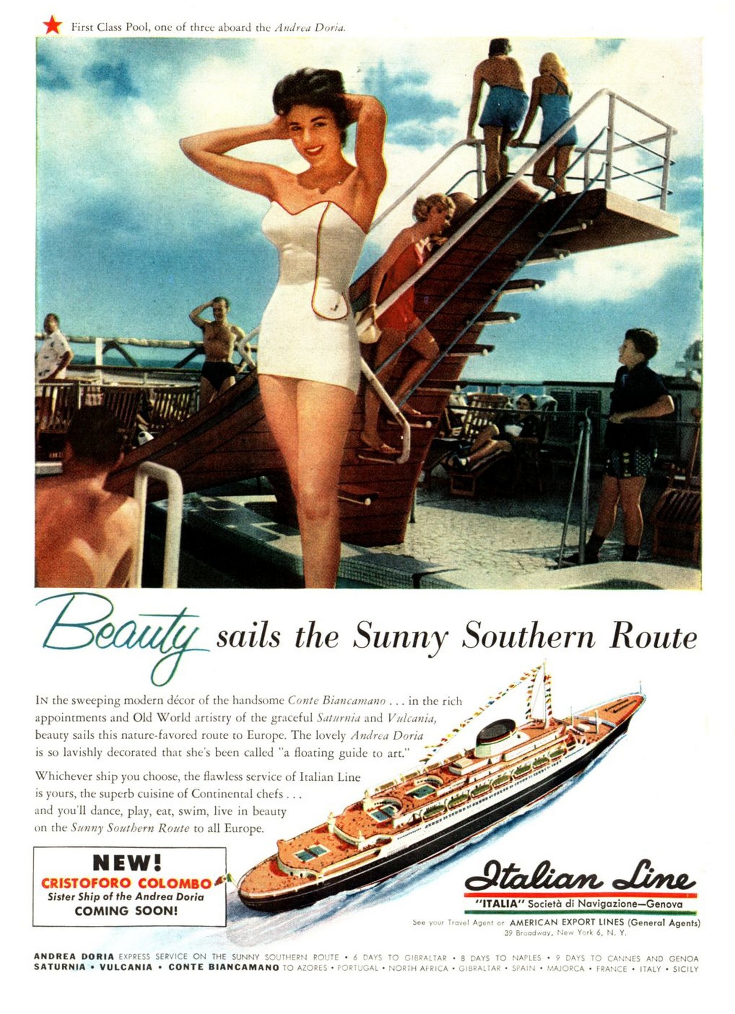 1954 Beauty sails the Sunny Southern Route. Cristoforo Colombo, Italian Line