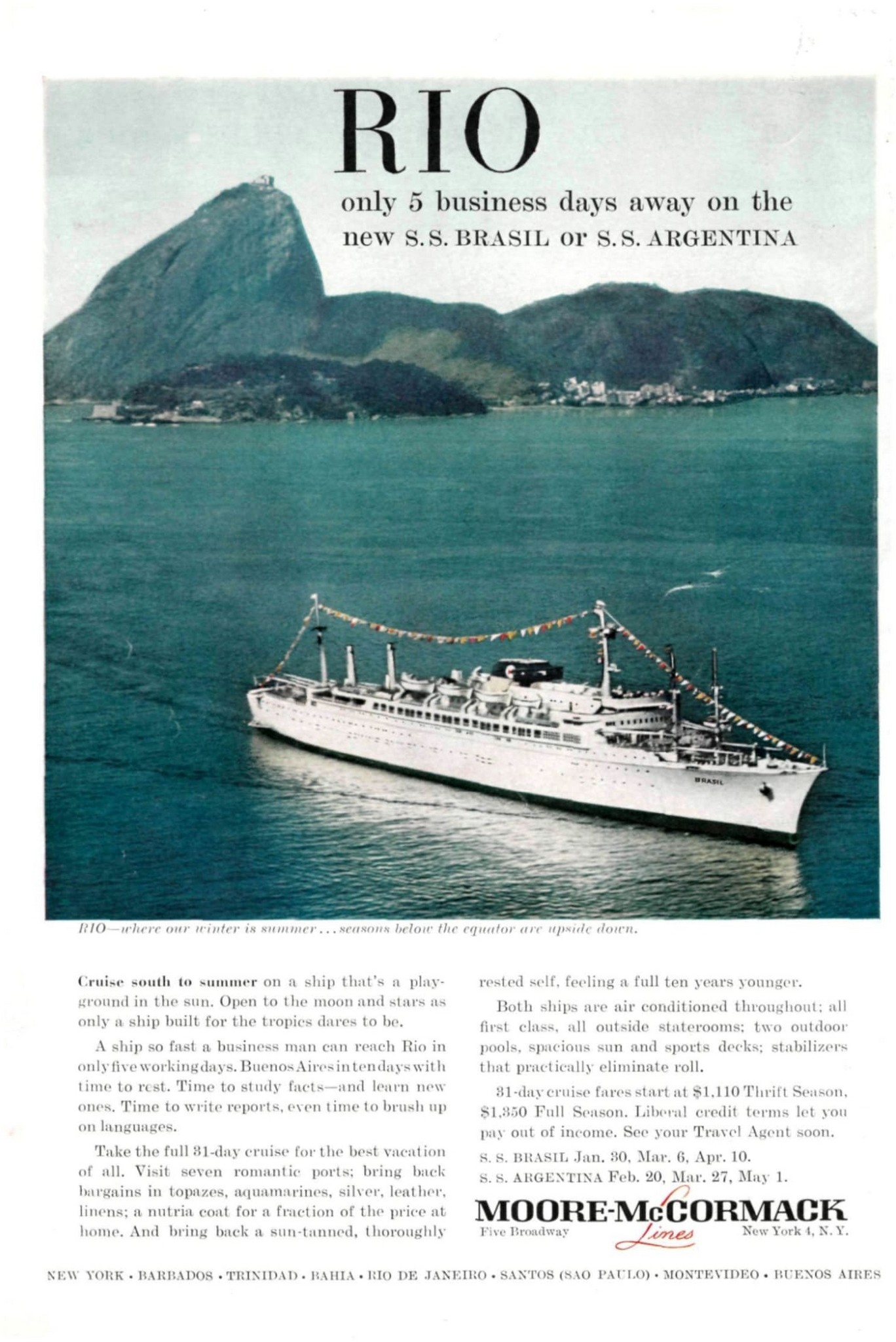 1959 Rio only 5 business days away on the new S.S. Brasil or S.S. Argentina. Moore-McGormack Lines