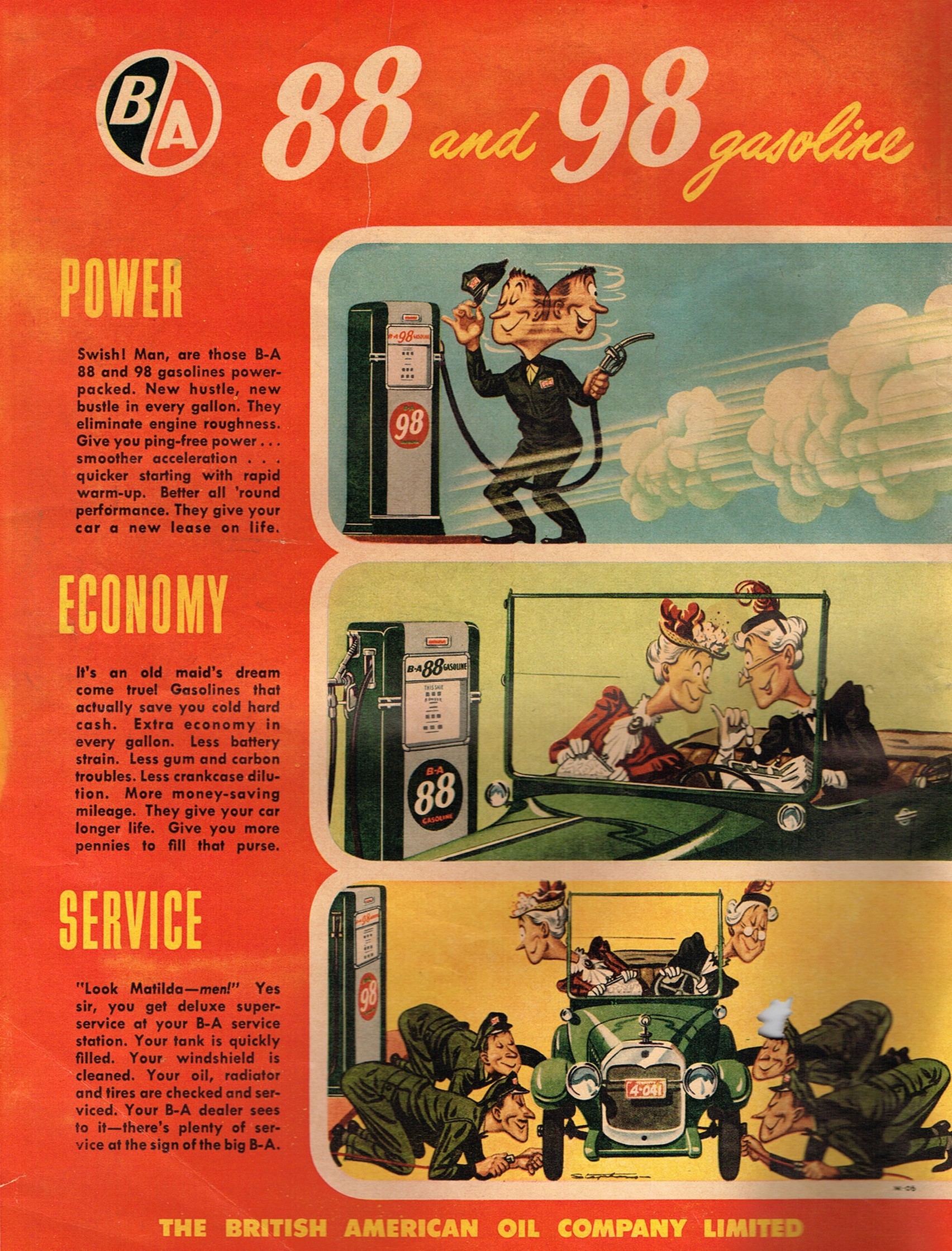 1950 B/A 88 and 98 gasoline. Power, Economy, Service. The British American Oil Company Limited