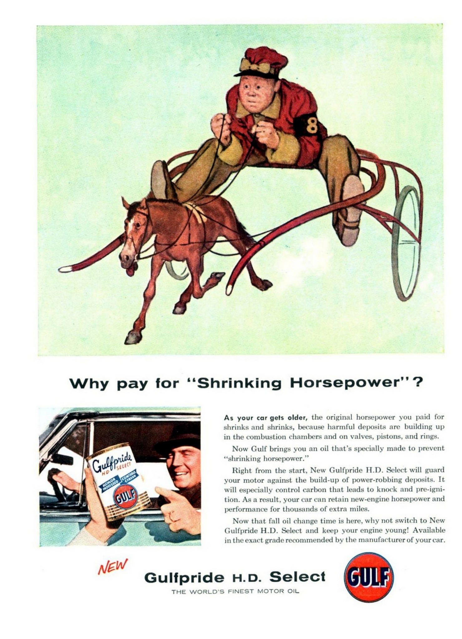 Main » Petroleum » Gulf Oil Ad and Poster Collection » 1955 Why pay for ‘Shrinking Horsepower’- Gulfpride H.D. Select Gulf