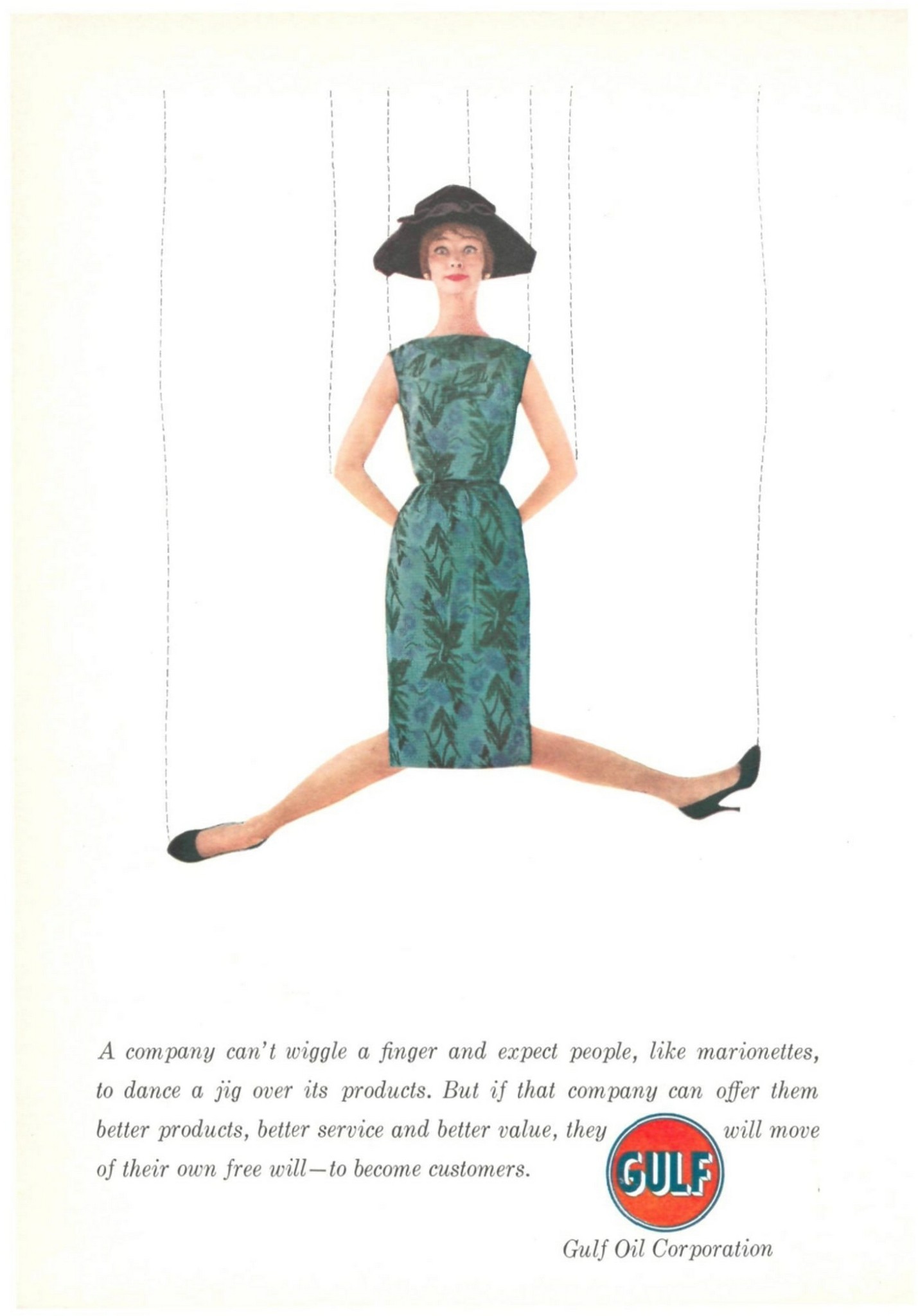 Main » Petroleum » Gulf Oil Ad and Poster Collection » 1959 A company can’t wiggle finger and expect people, like marionettes to dance a jig over its products. Gulf