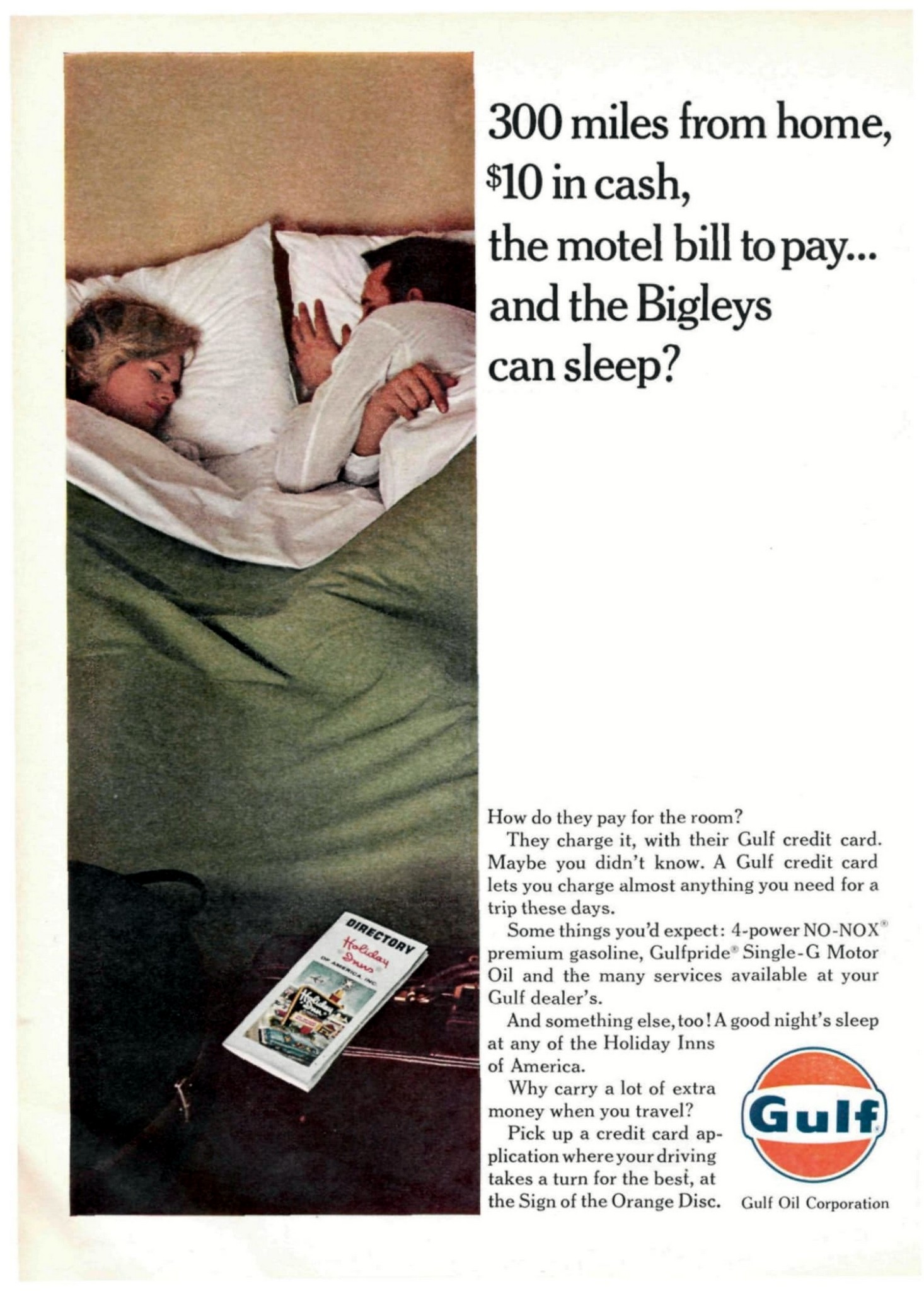 Main » Petroleum » Gulf Oil Ad and Poster Collection » 1965 300 miles from home, $10 in cash, the motel bill to pay… and the Bigleys can sleep. Gulf