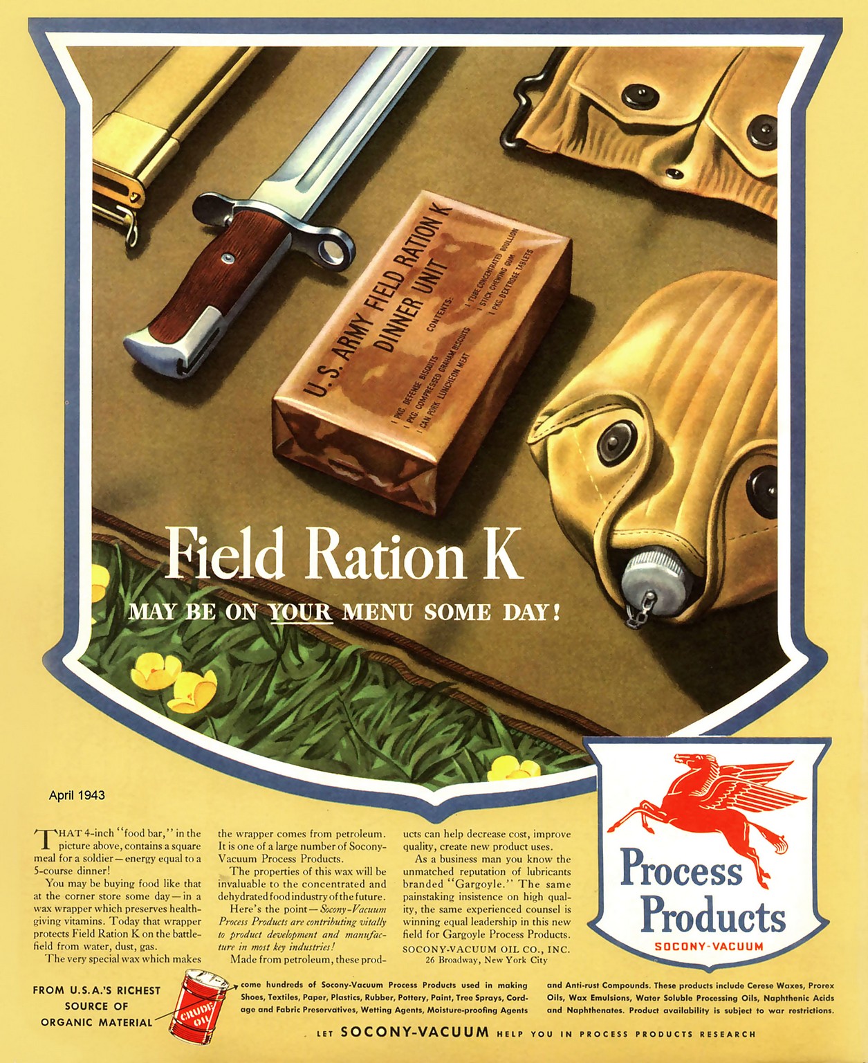 1943 Field Ration K May Be On Your Menu Some Day. Process Products. Socony-Vacuum