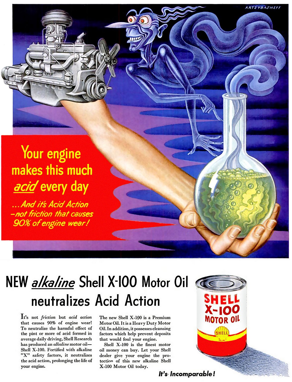 1951 New alkaline Shell X-100 Motor Oil neutralizes Acid Action