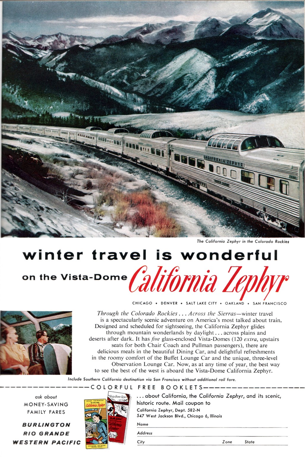 1958 Winter travel is wonderful on the Vista-Dome California Zephyr. Burlington – Rio Grande – Western Pacific
