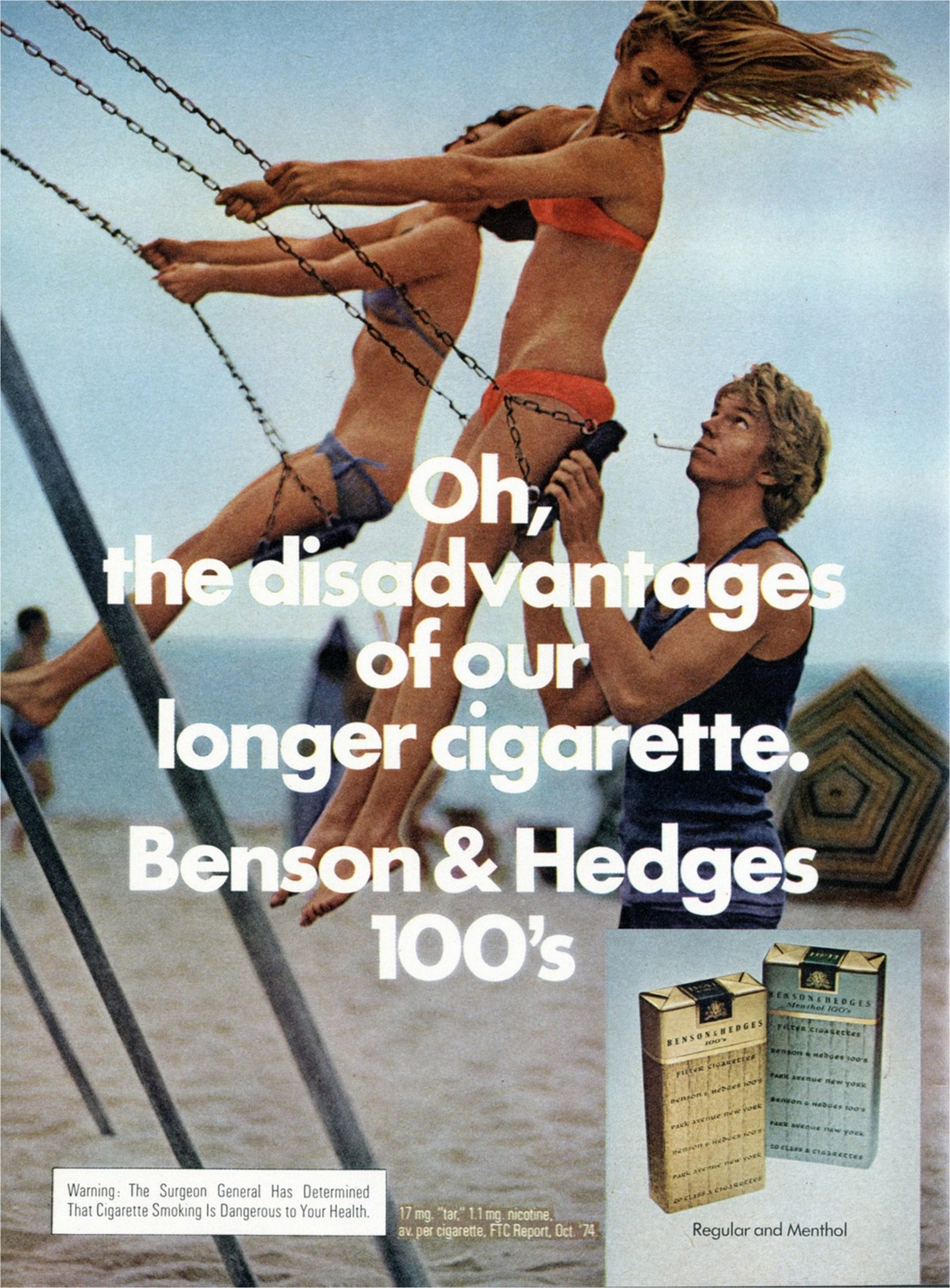 1974 Oh, the disadvantages of our longer cigarette. Benson & Hedges 100's (3)