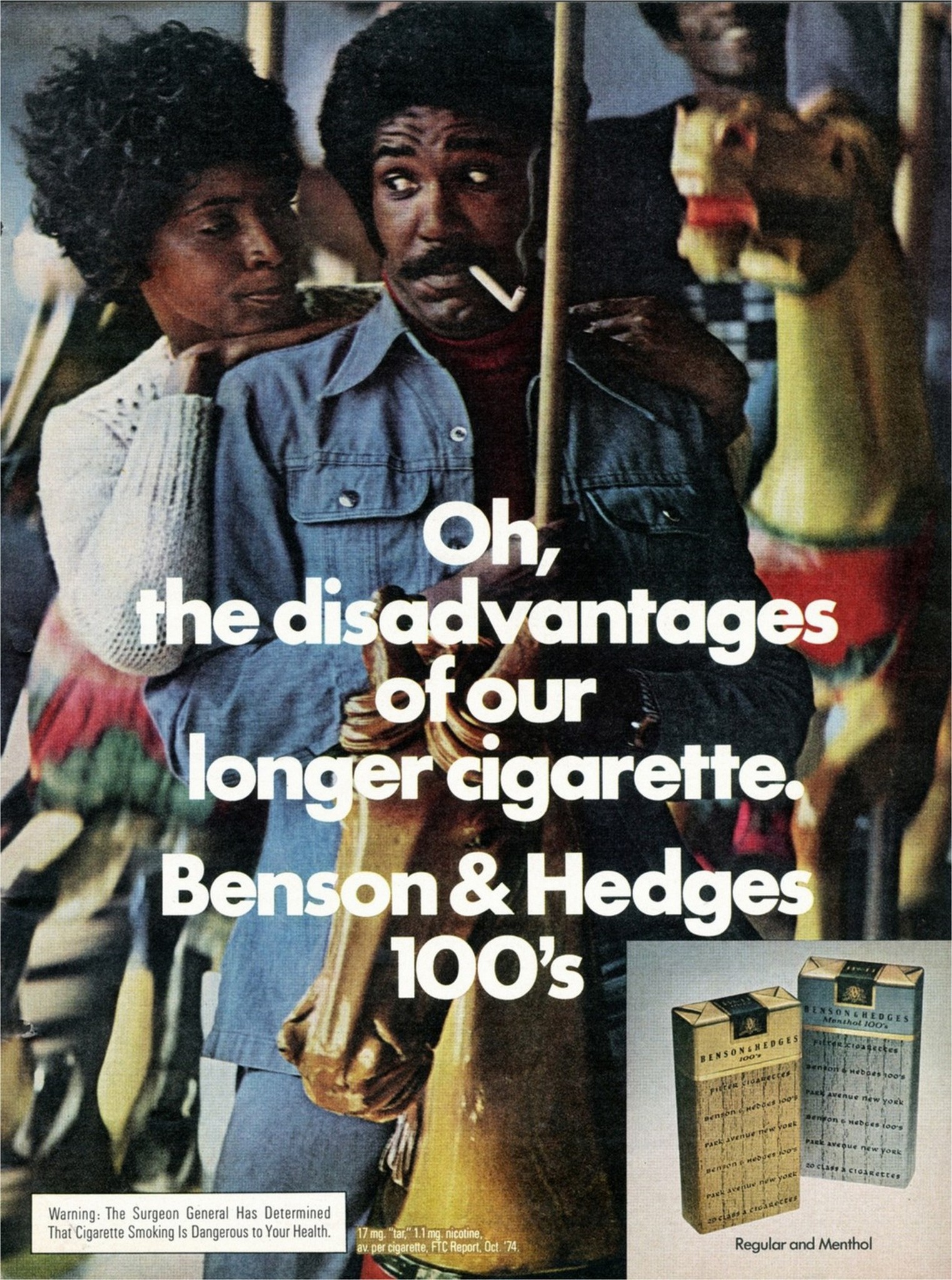 1974 Oh, the disadvantages of our longer cigarette. Benson & Hedges 100's