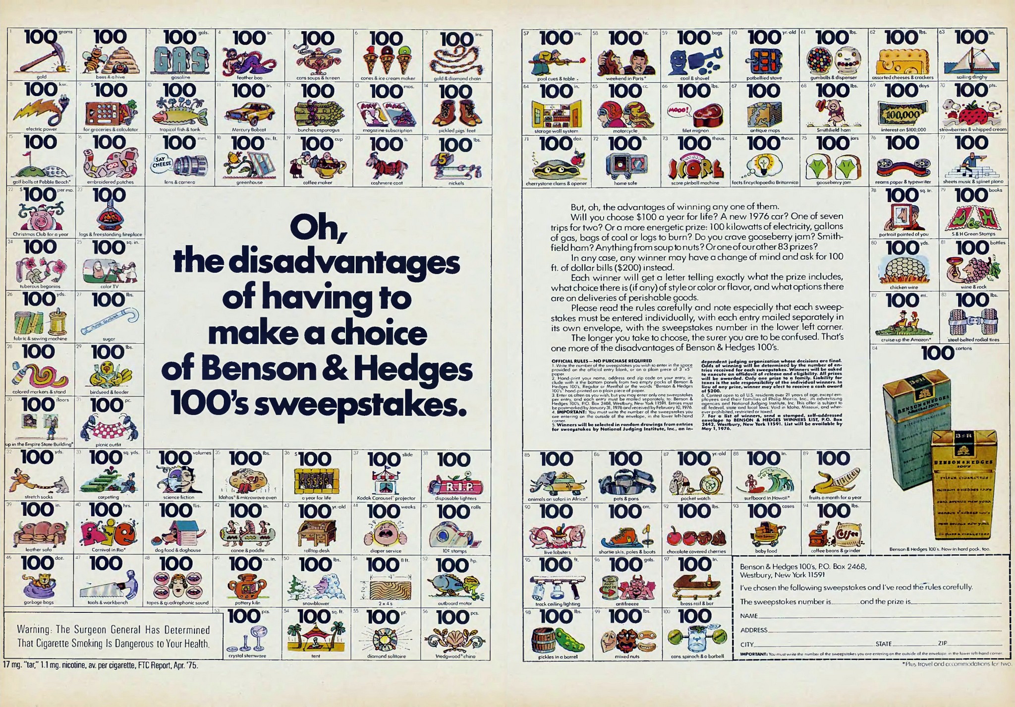 1975 Oh, the disadvantages of having to make a choice of Benson & Hedges 100's sweepstakes