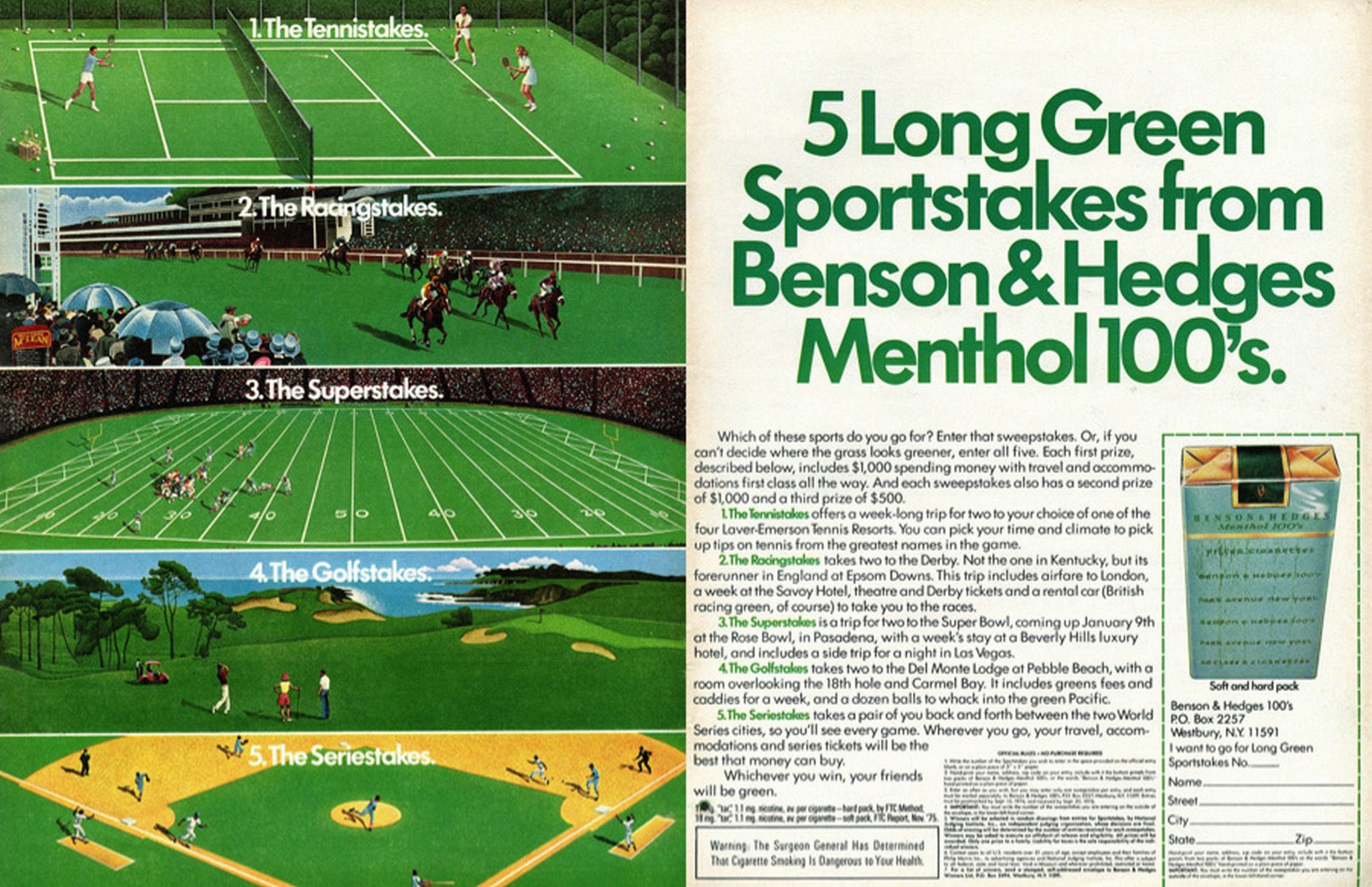 1976 5 Long Green Sportstakes from Benson & Hedges Menthol 100's