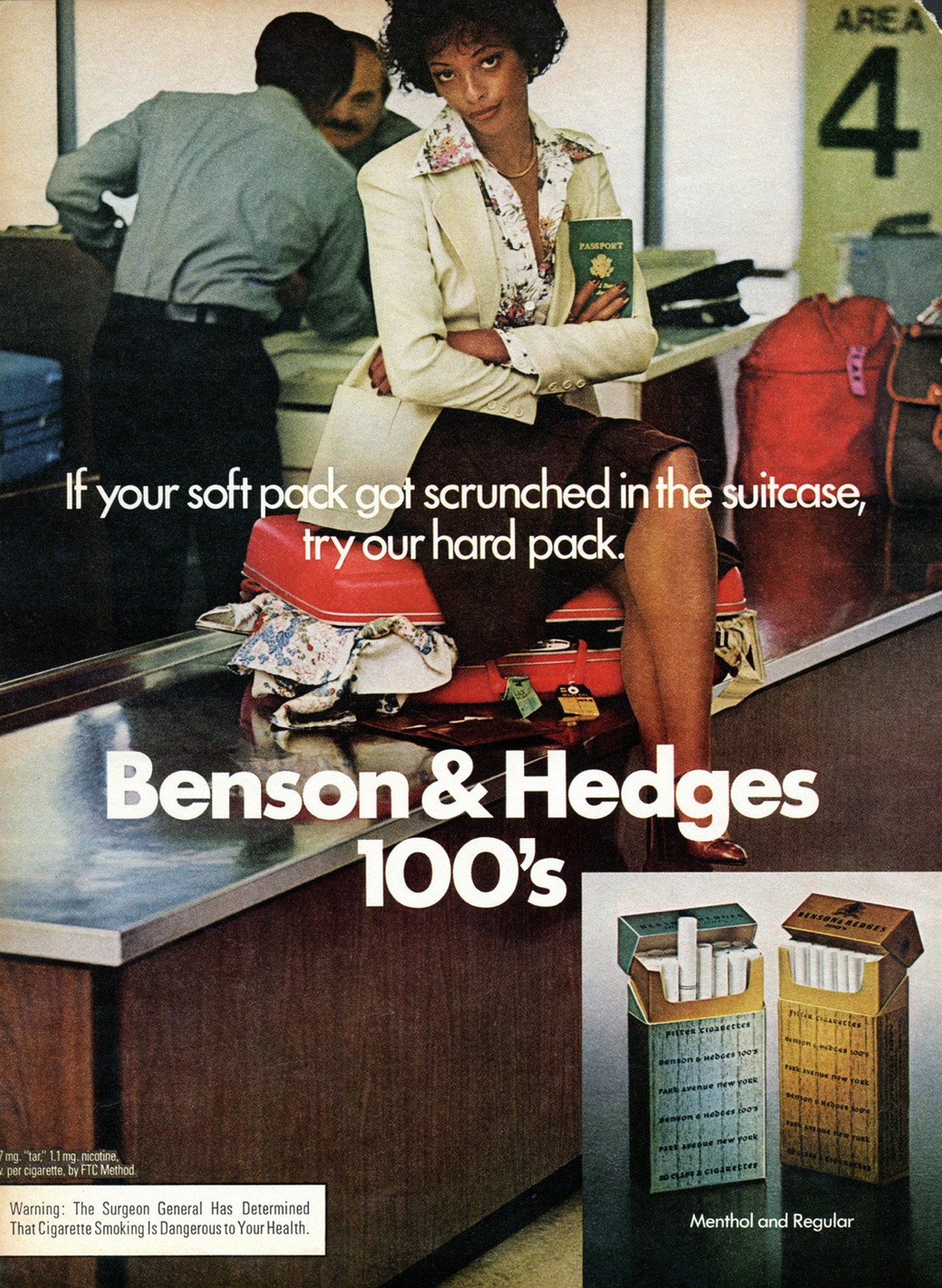 1977 If your soft pack got scrunched in the suitcase, try our hard pack. Benson & Hedges 100’s