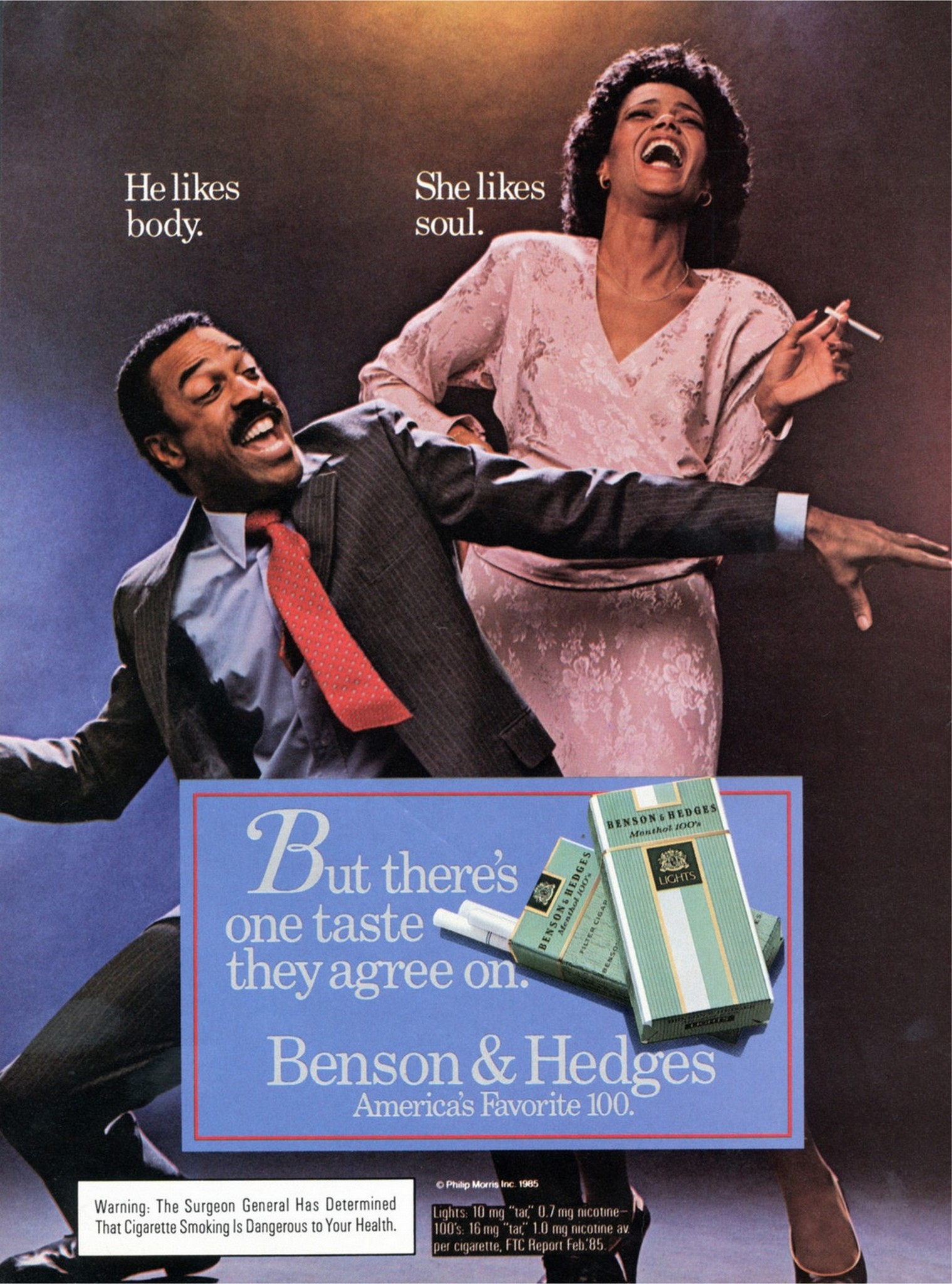 1985 He likes body. She likes soul. But there's one taste they agree on. Benson & Hedges