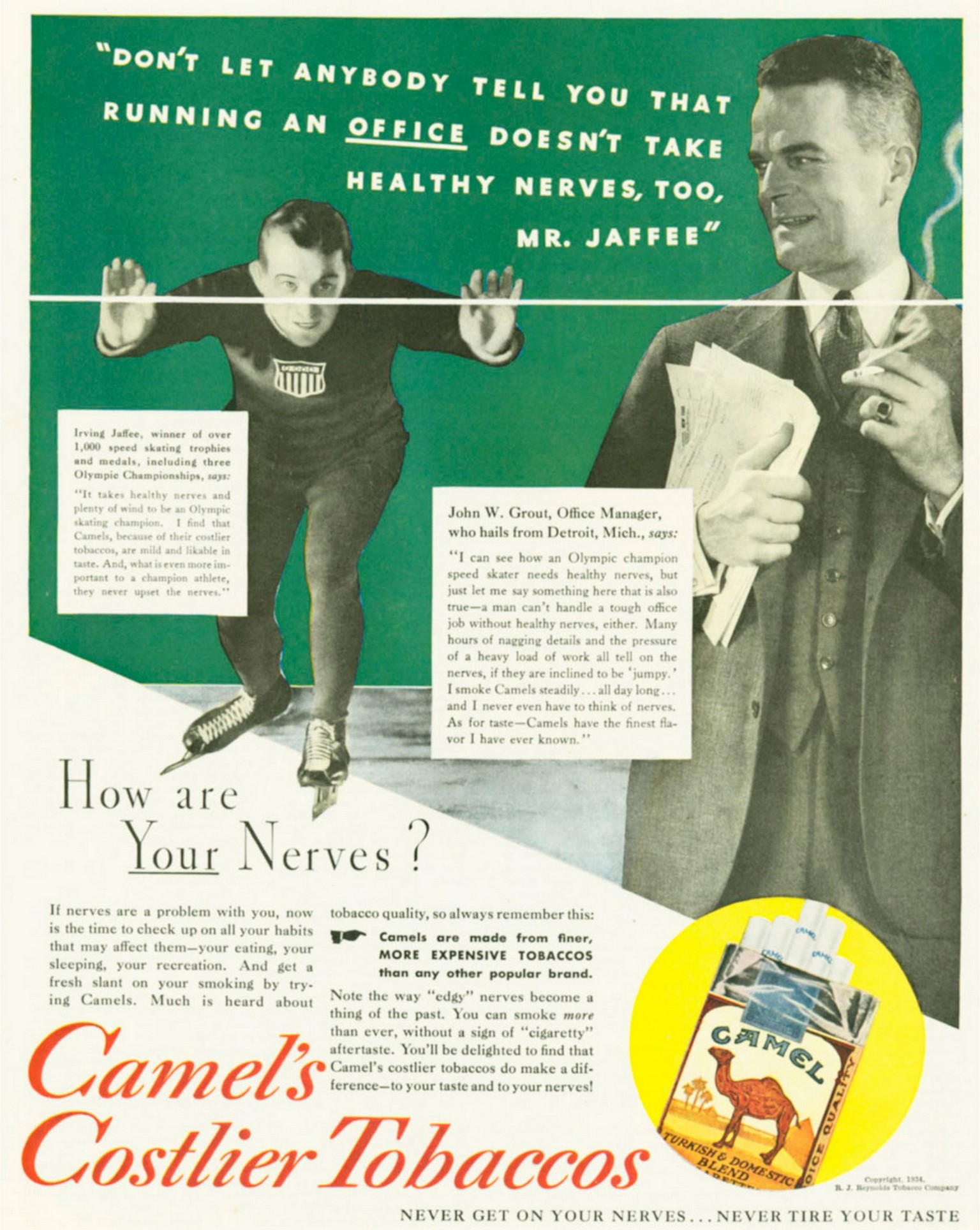 1934 ‘Don’t Let Anybody Tell You That Running An Office Doesn’t Take Healthy Nerves, Too, Mr. Jaffee. How are Your Nerves. Camel