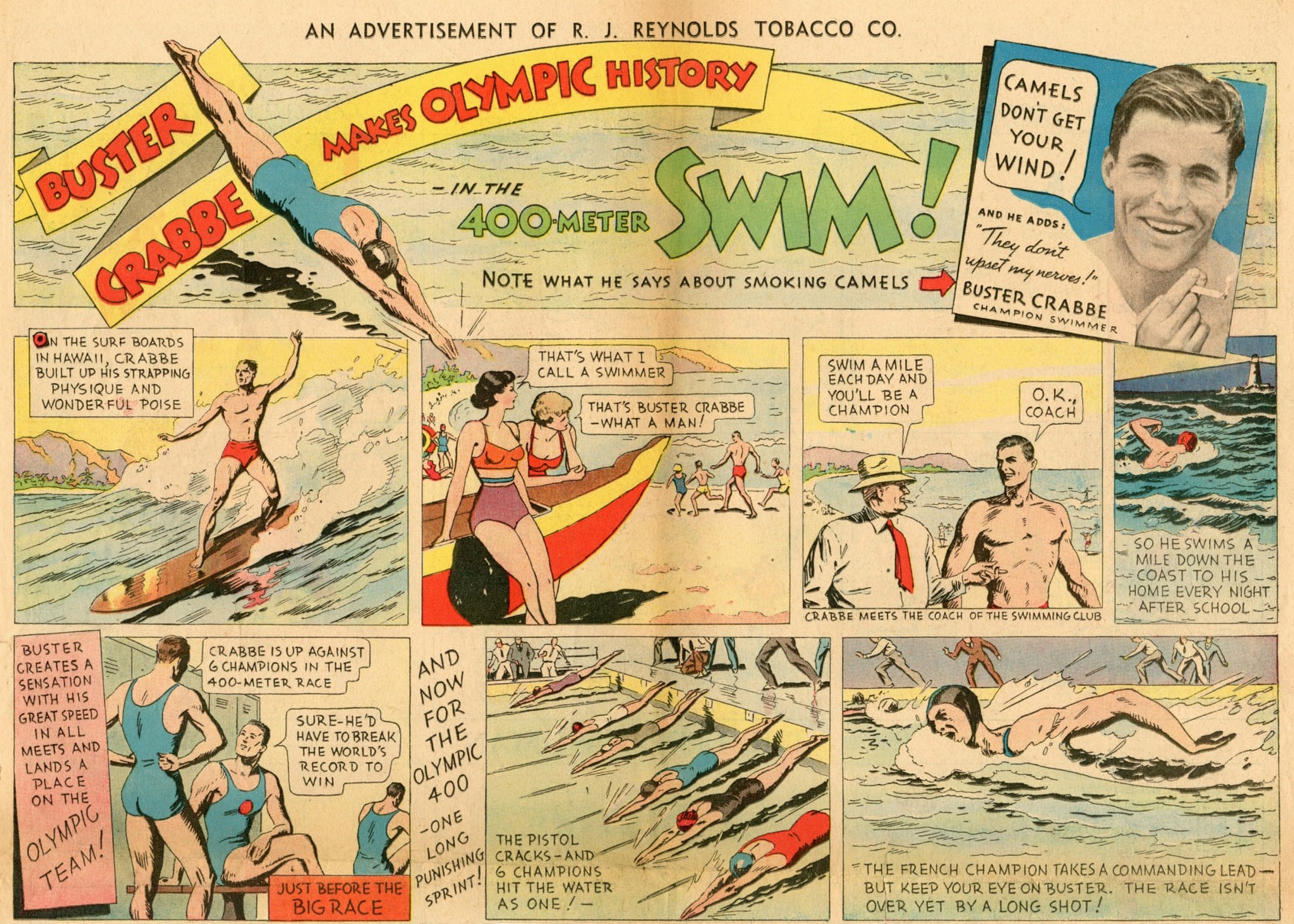 1935 Buster Crabbe Makes Olympic History – In The 400-Meter Swim! Camel