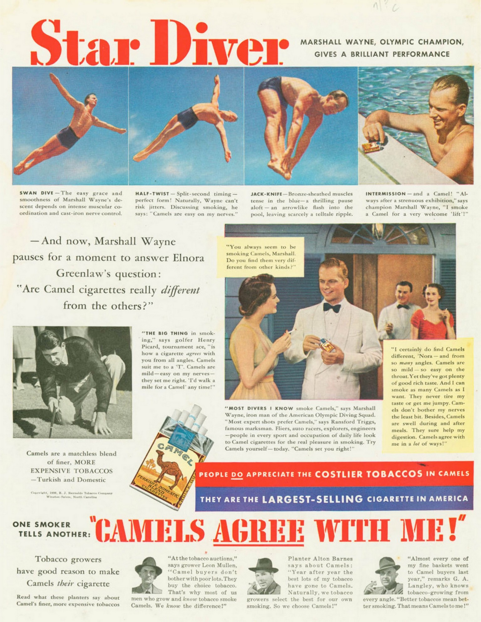 1938 Star Diver Marshall Wayne, Olympic Champion, Gives A Brilliant Performance. ‘Camels Agree With Me!’