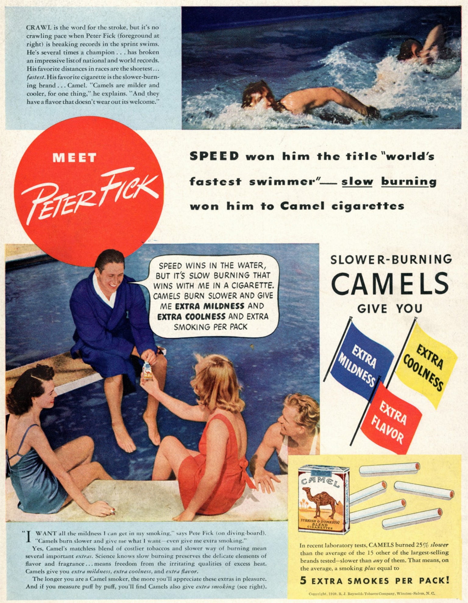 1940 Meet Peter Fick. Speed won him the title ‘world’s fastest swimmer’ – slow burning won him to Camel cigarettes