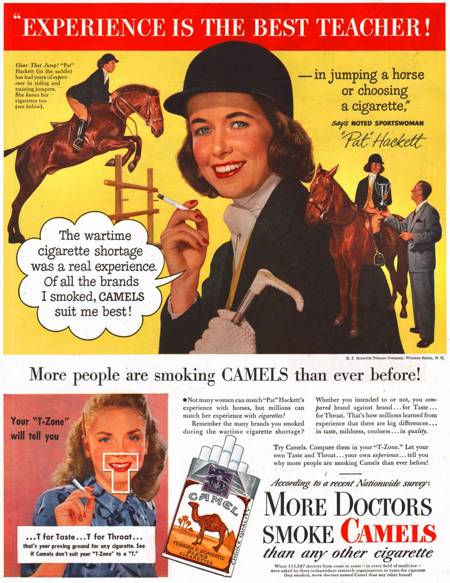 1947 ‘Experience Is The Best Teacher! Pat Hackett. More people are smoking Camels than ever before!
