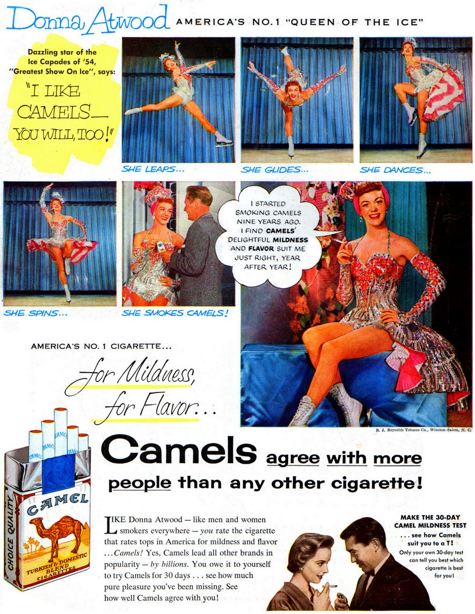 1954 Donna Atwood America's No.1 'Queen Of The Ice' Camels agree with more people than any other cigarette!