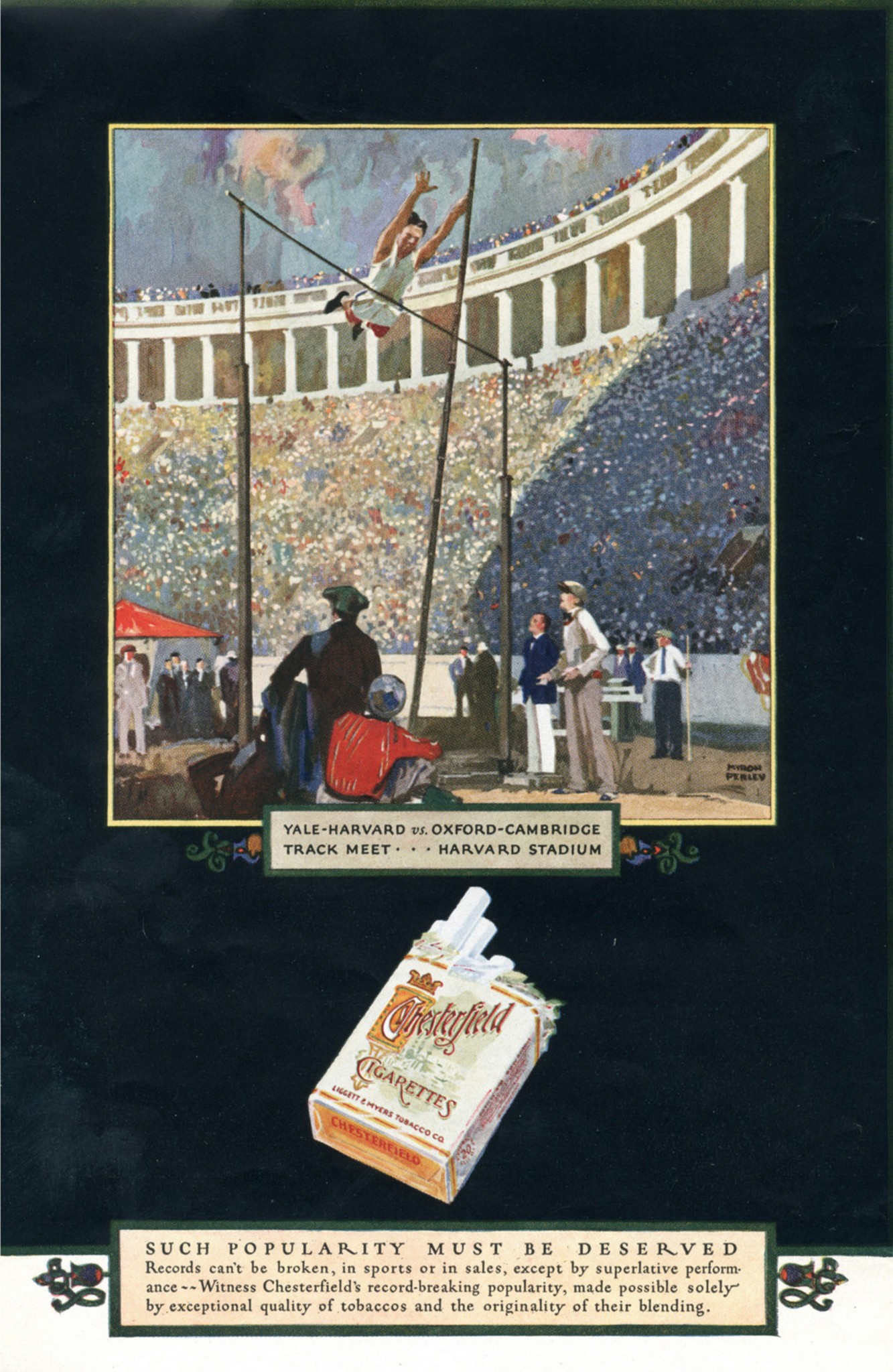 Main » Smoking » Chesterfield Ad and Poster Collection » 1925 Yale-Harvard vs. Oxford-Cambridge Track Meet … Harvard Stadium. Chesterfield