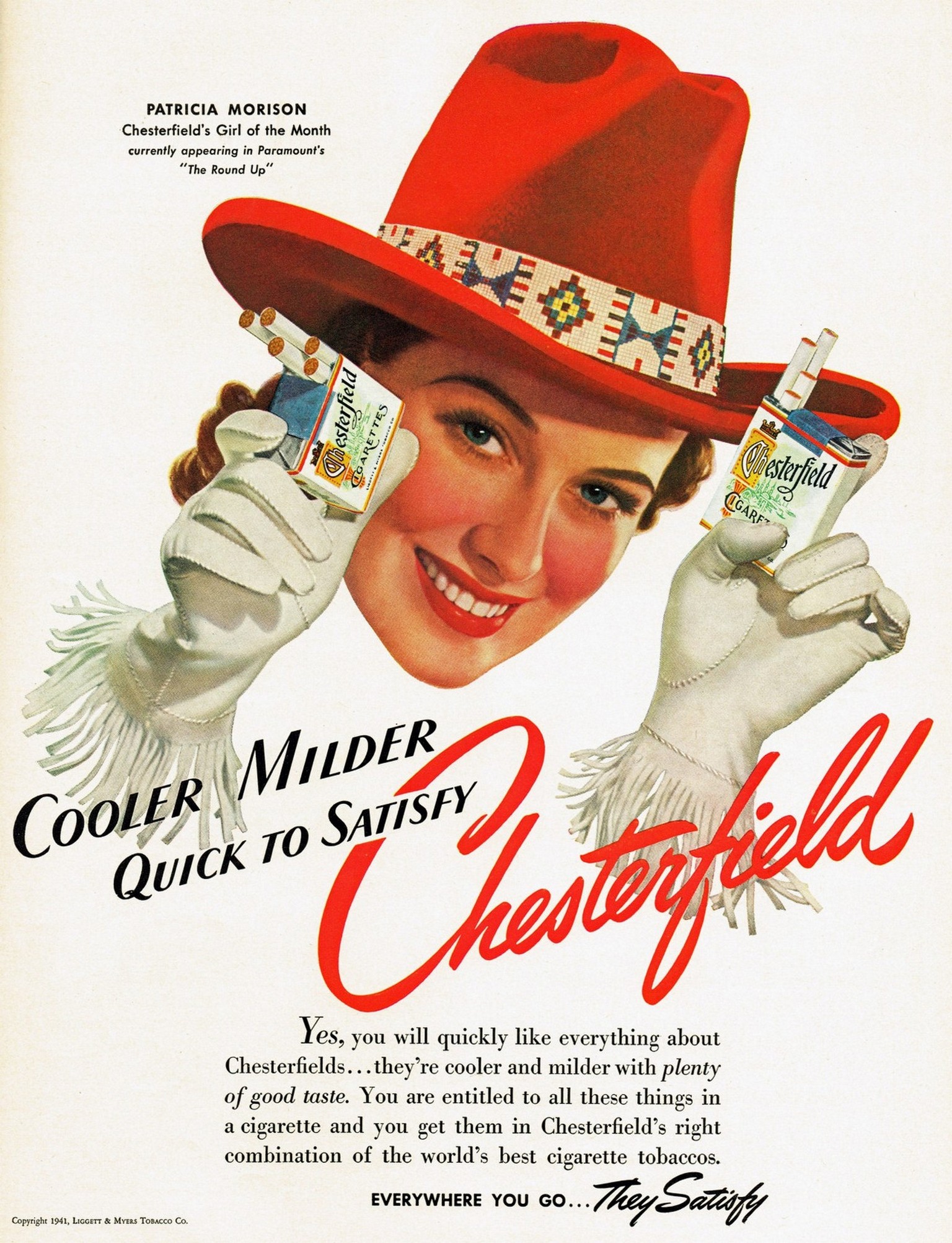 Main » Smoking » Chesterfield Ad and Poster Collection » 1941 Cooler Milder Quick To Satisfy Chesterfield. Patricia Morison