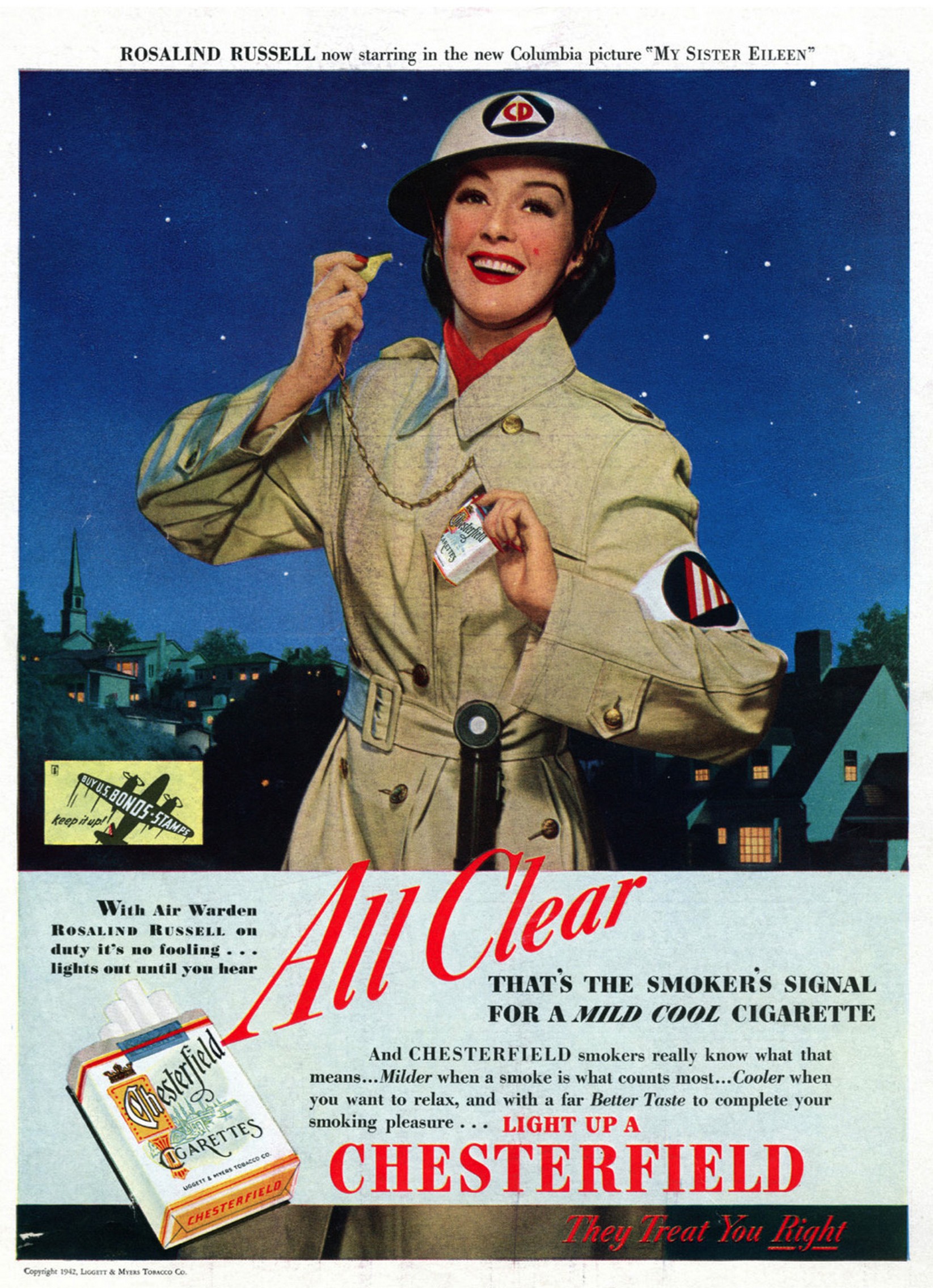 Main » Smoking » Chesterfield Ad and Poster Collection » 1942 Rosalind Russell. All Clear. That’s The Smoker’s Signal For A Mild Cool Cigarette. Chesterfield (1)