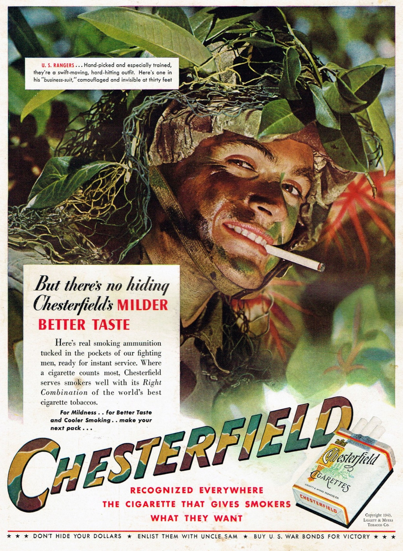 Main » Smoking » Chesterfield Ad and Poster Collection » 1943 But there’s no hiding Chesterfield’s Milder Better Taste